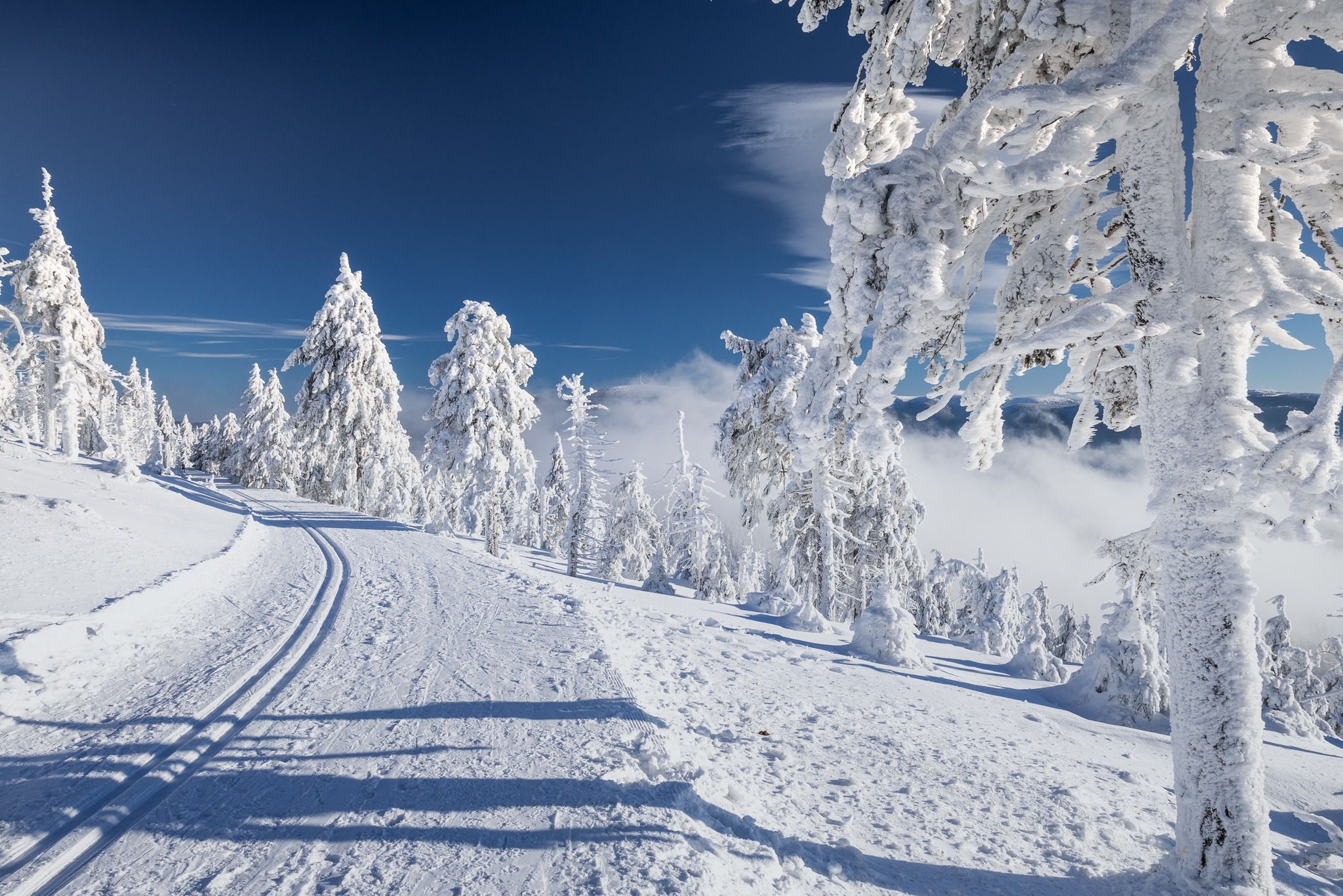 Edytor tapety: Zaśnieżona droga na wzgórzu wśród drzew