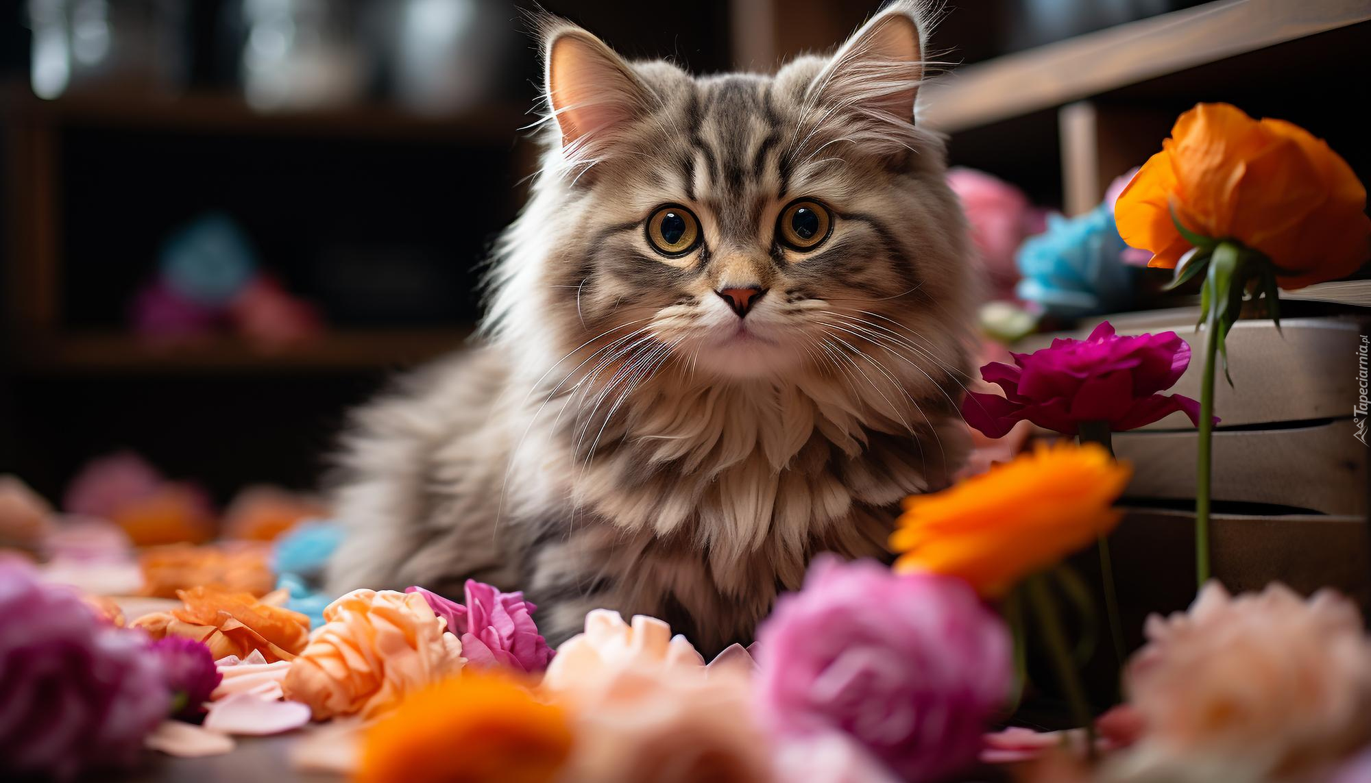 Edytor tapety: Kot leżący na podłodze usłanej kwiatami