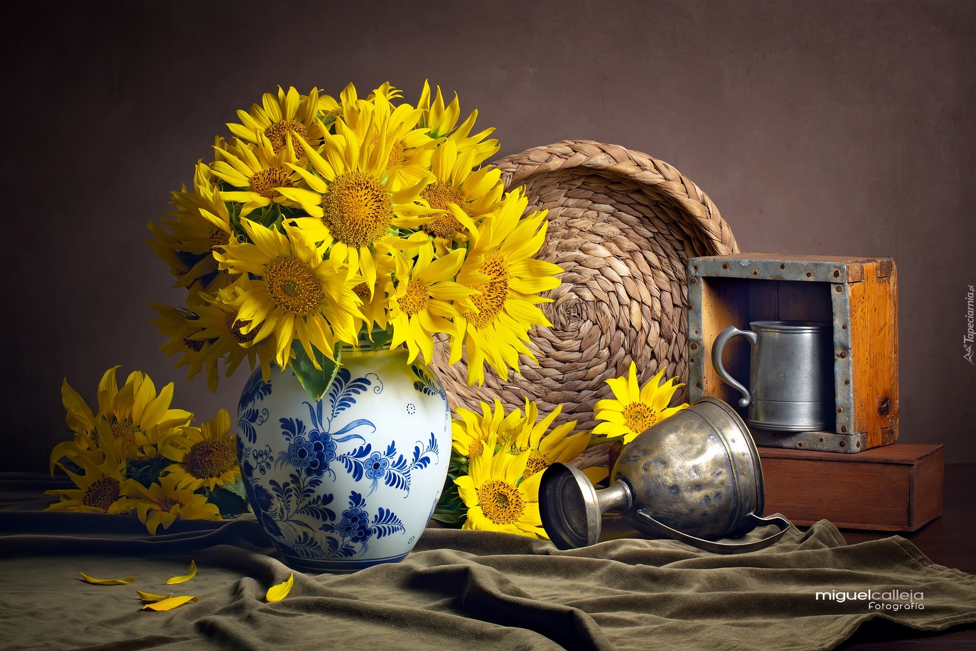 Edytor tapety: Stare naczynia obok wazonu z bukietem słoneczników