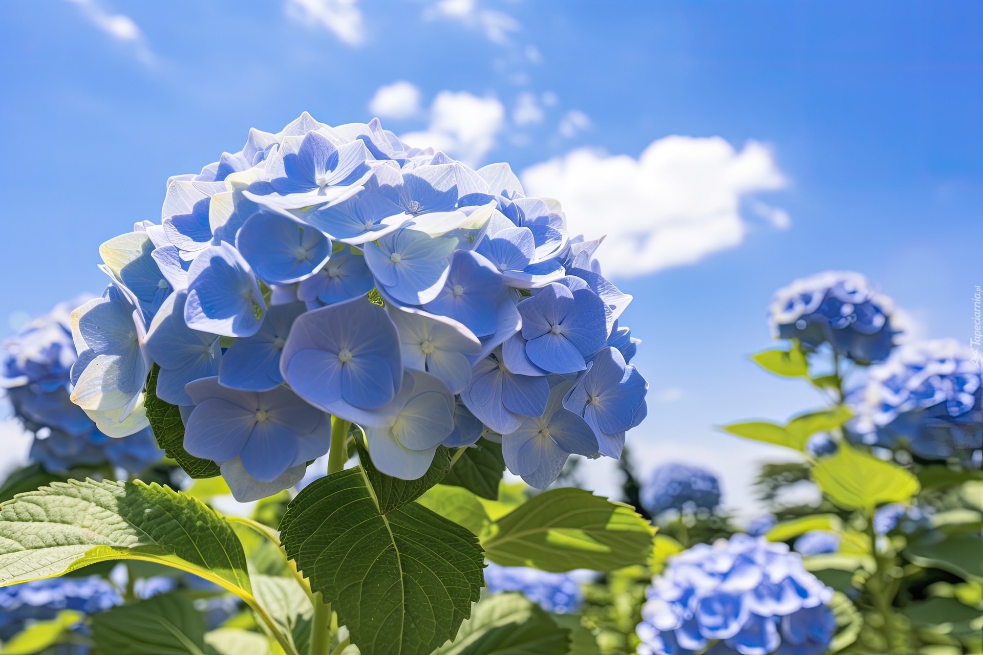 Edytor tapety: Niebieskie hortensje na tle nieba