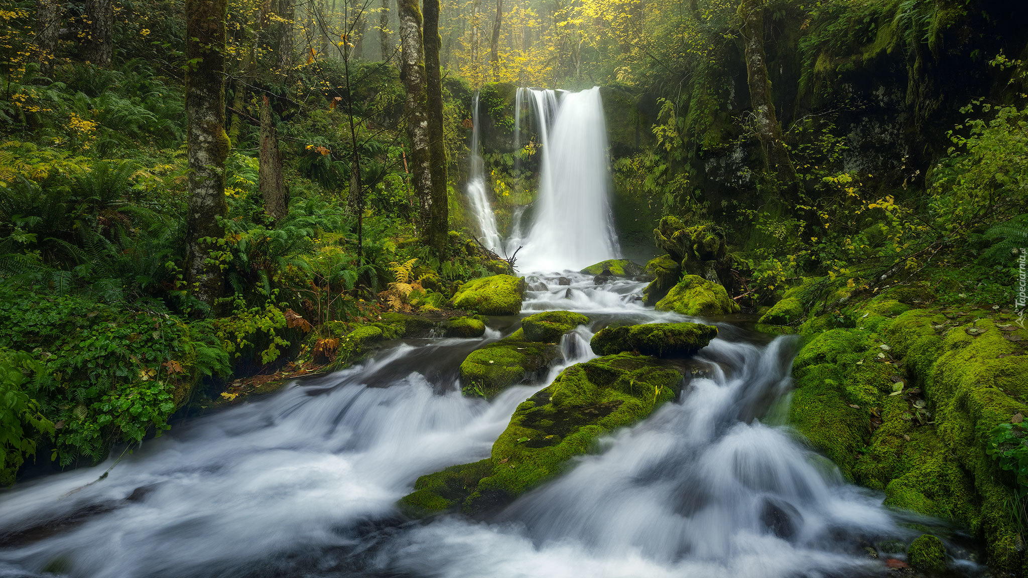 Edytor tapety: Omszałe skały przy leśnym wodospadzie
