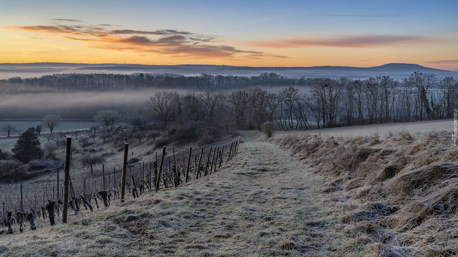 Edytor tapety: Oszronione pola i drzewa w porannej mgle
