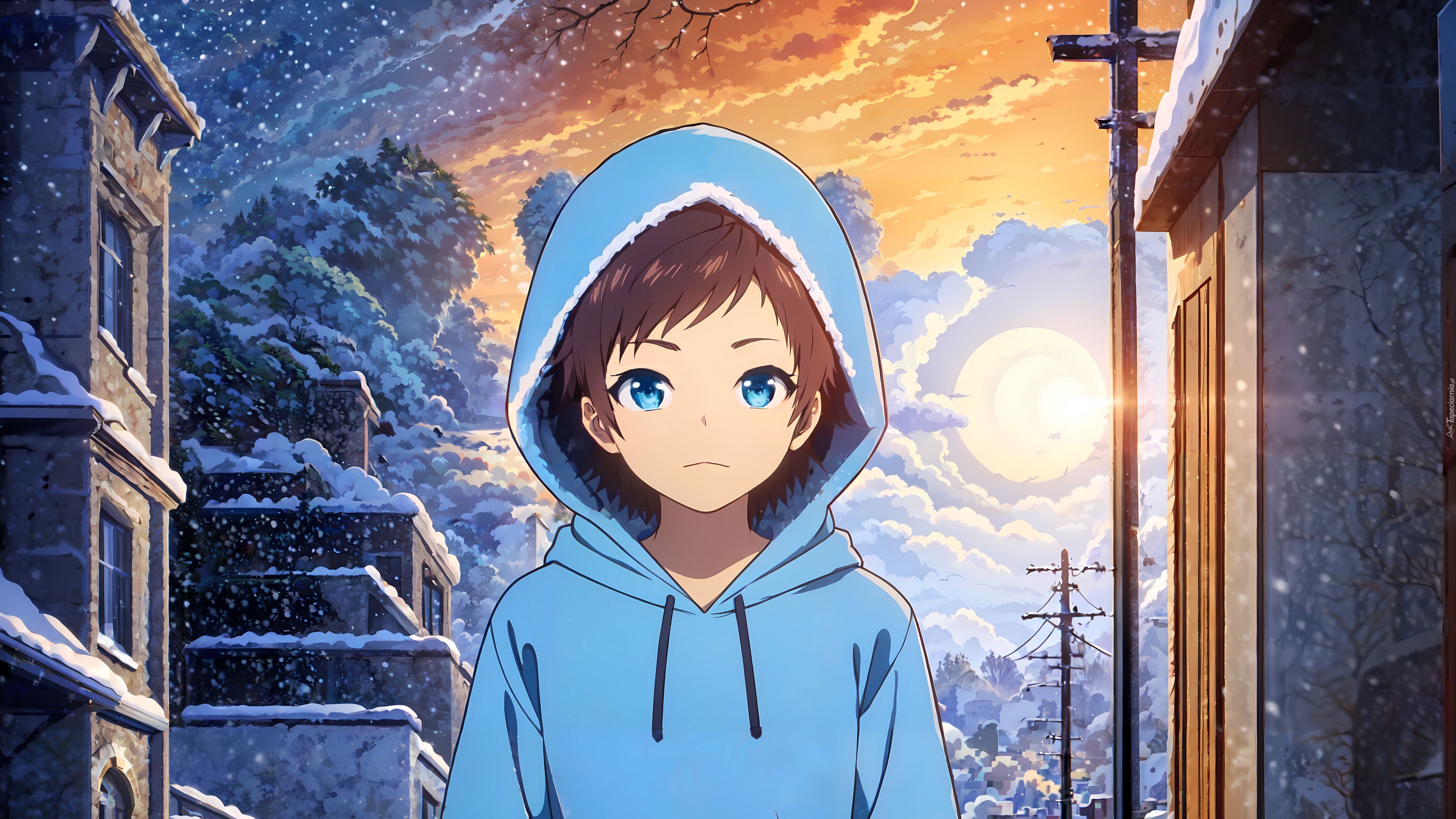 Edytor tapety: Postać w niebieskiej bluzie z kapturem