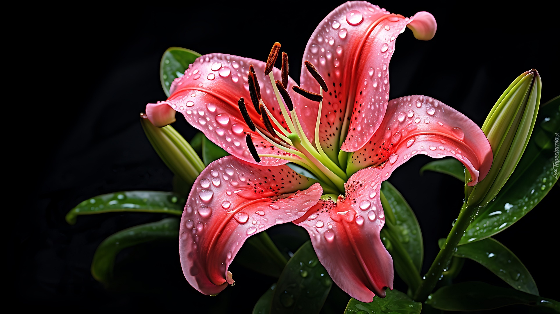 Edytor tapety: Lilia z liśćmi pokryta kropelkami wody