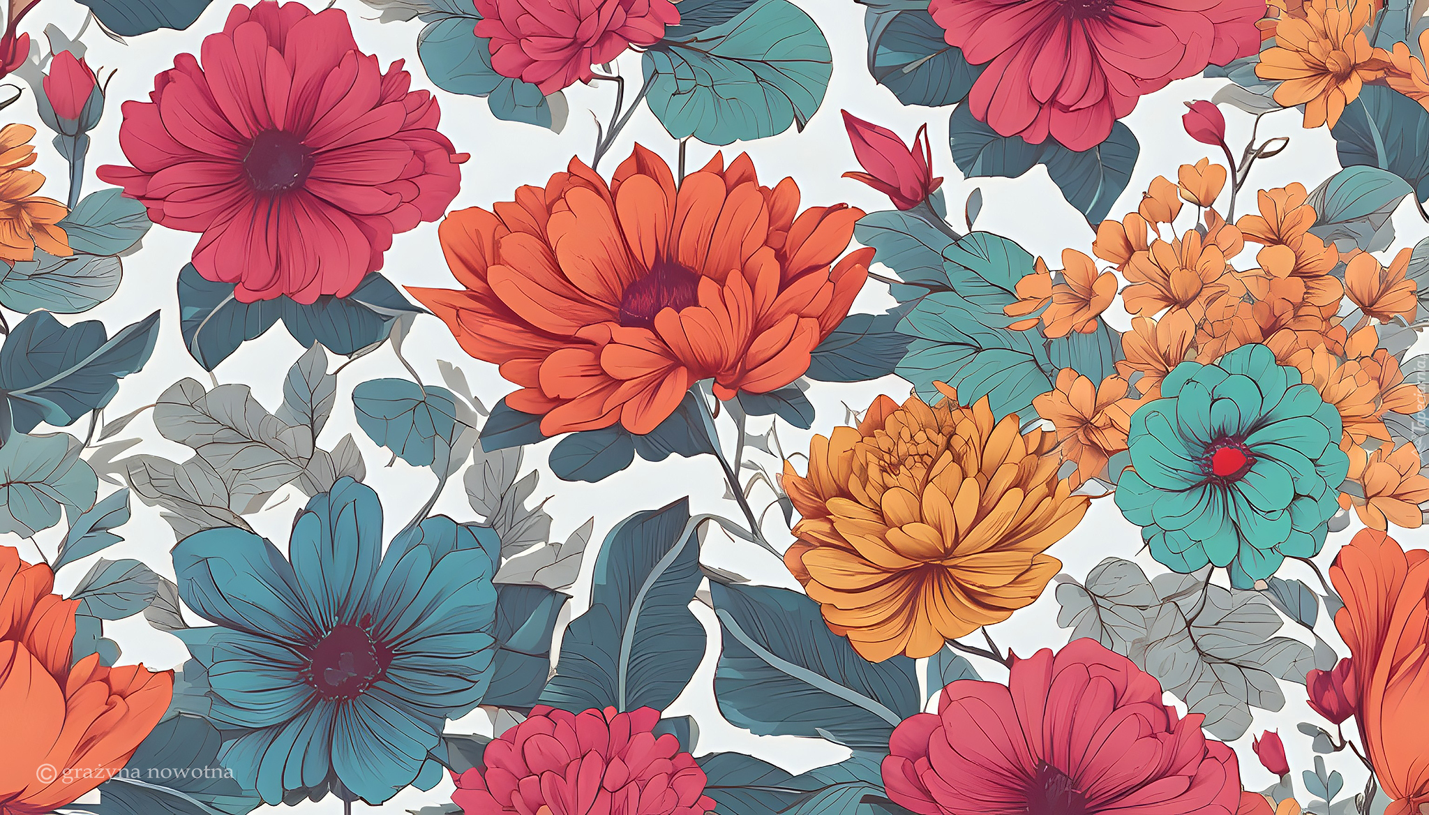 Edytor tapety: Kolorowe kwiaty z liśćmi na białym tle