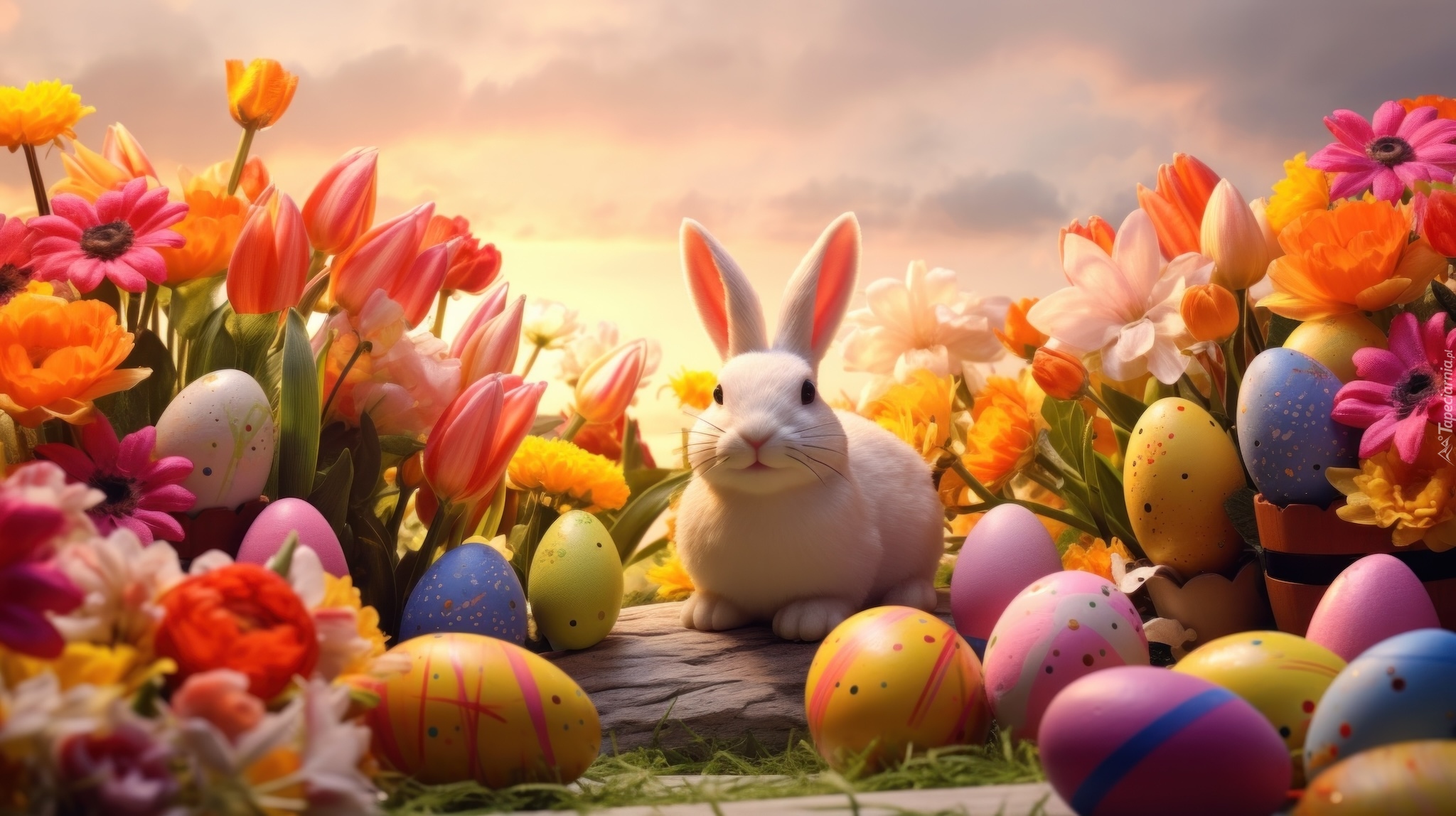 Edytor tapety: Królik wśród kolorowych kwiatów i pisanek