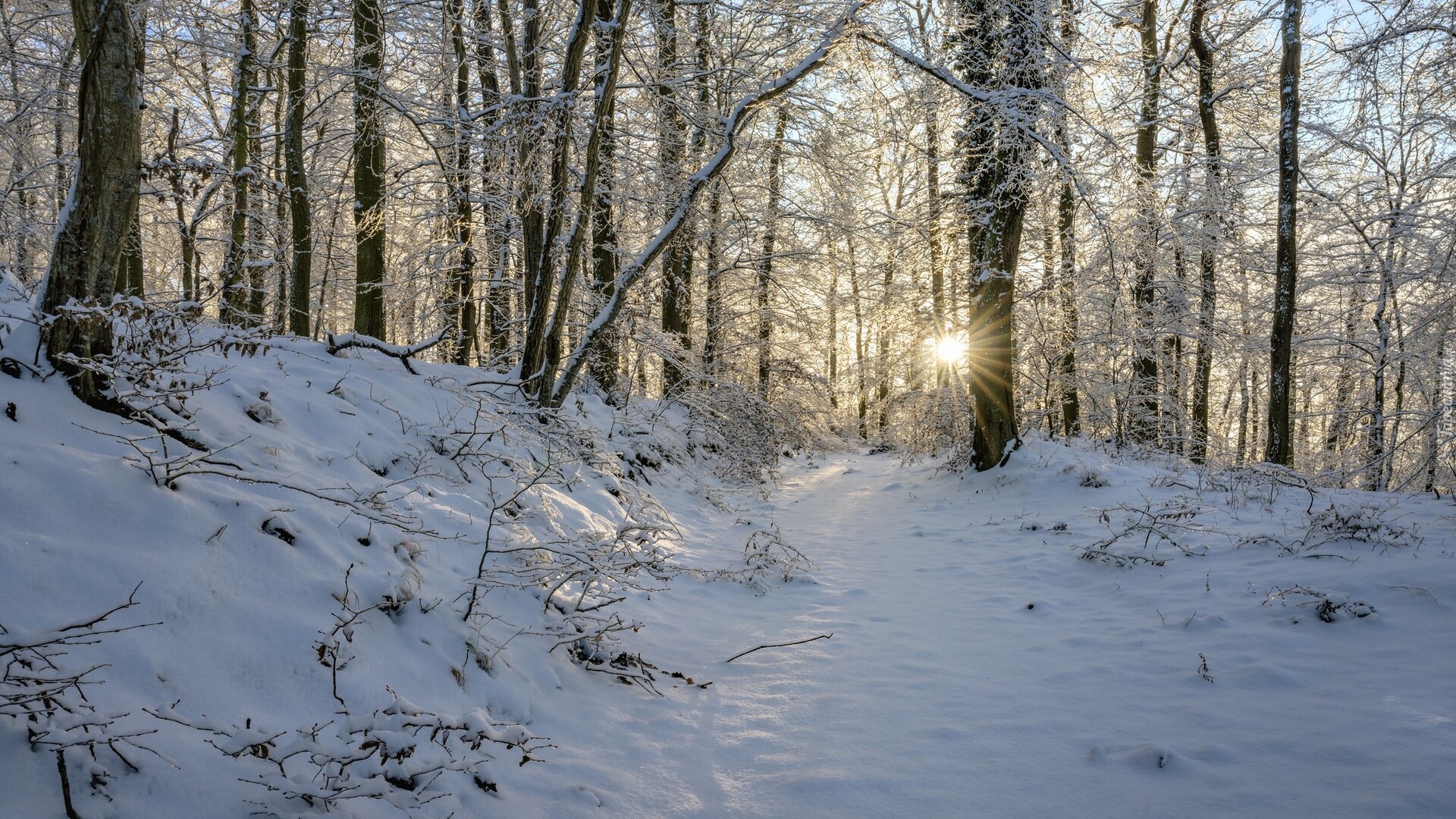 Edytor tapety: Promienie słoneczne między drzewami w zimowym lesie