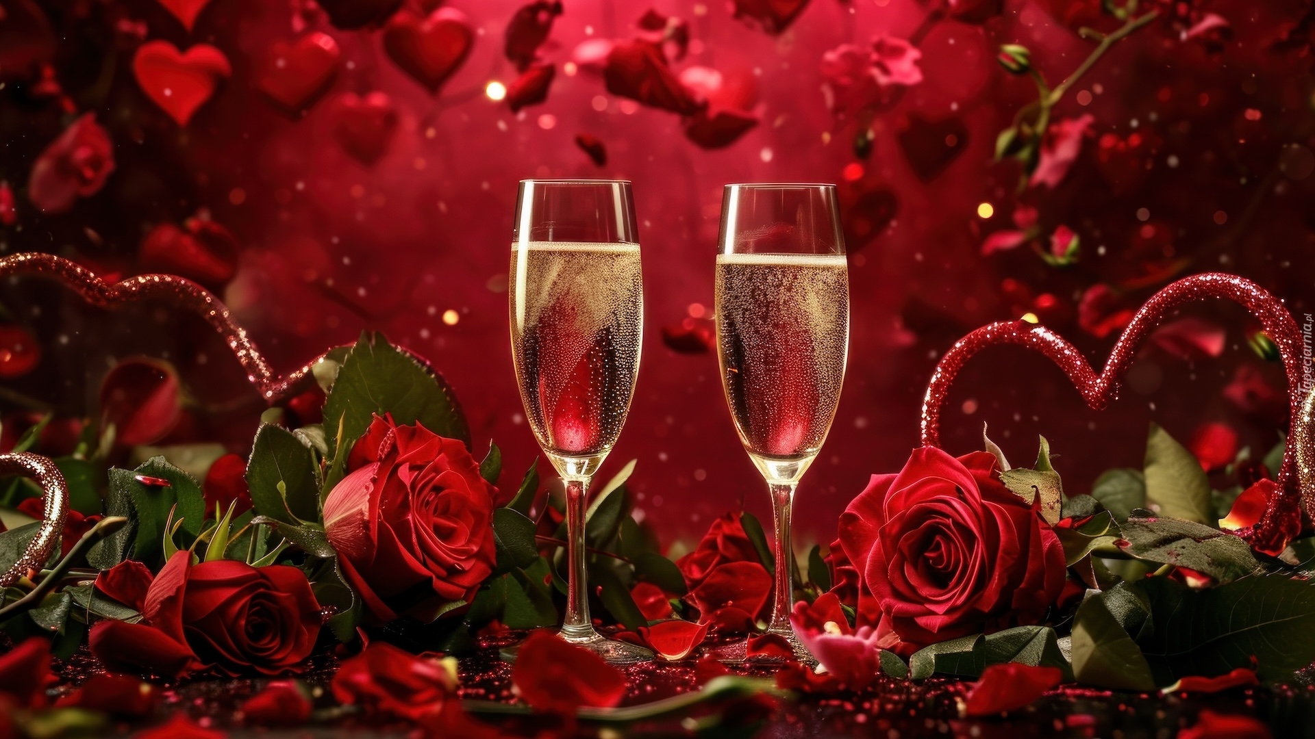 Edytor tapety: Dwa kieliszki z szampanem wśród czerwonych róż