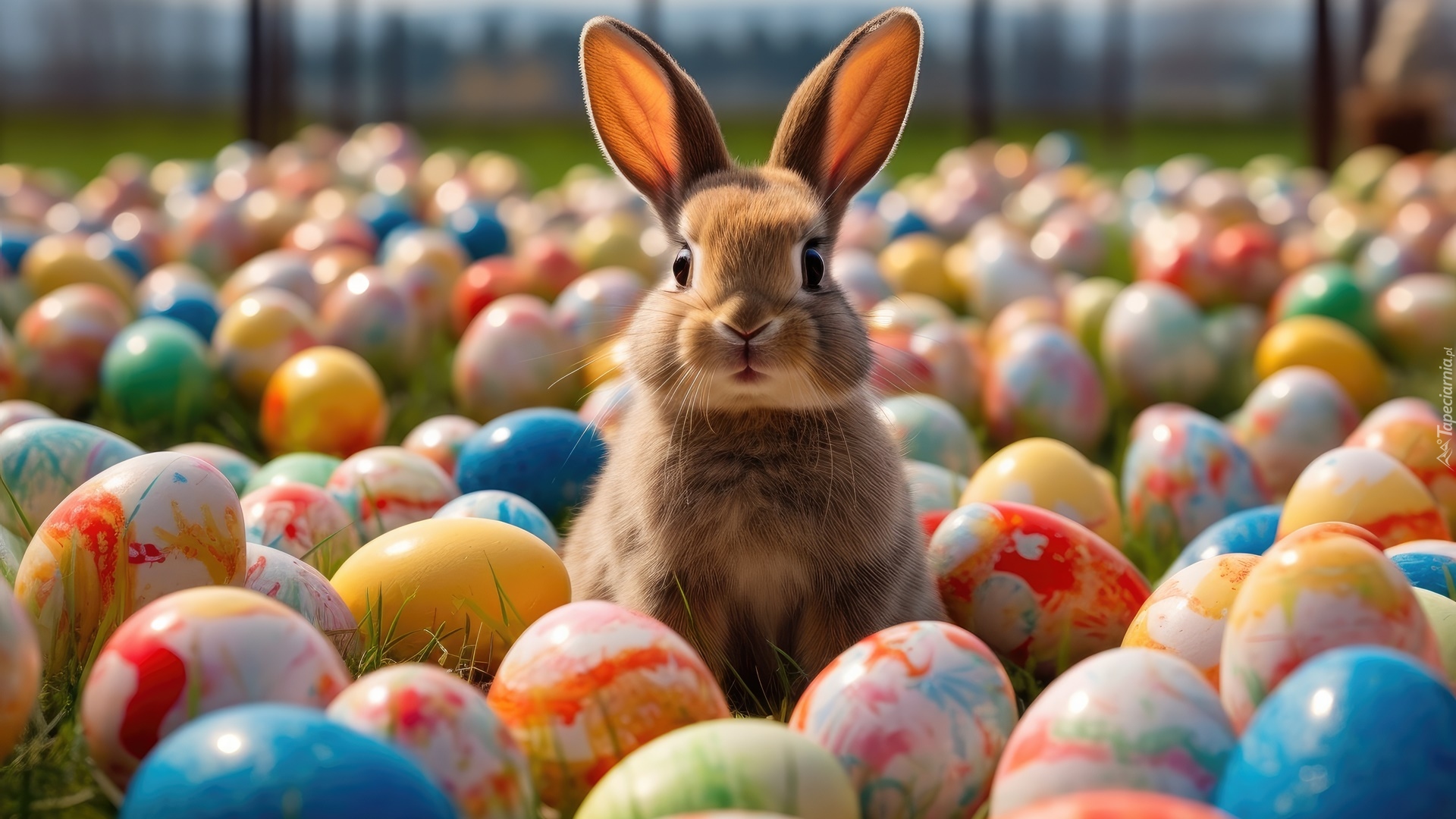 Edytor tapety: Królik wśród kolorowych pisanek w grafice 2D
