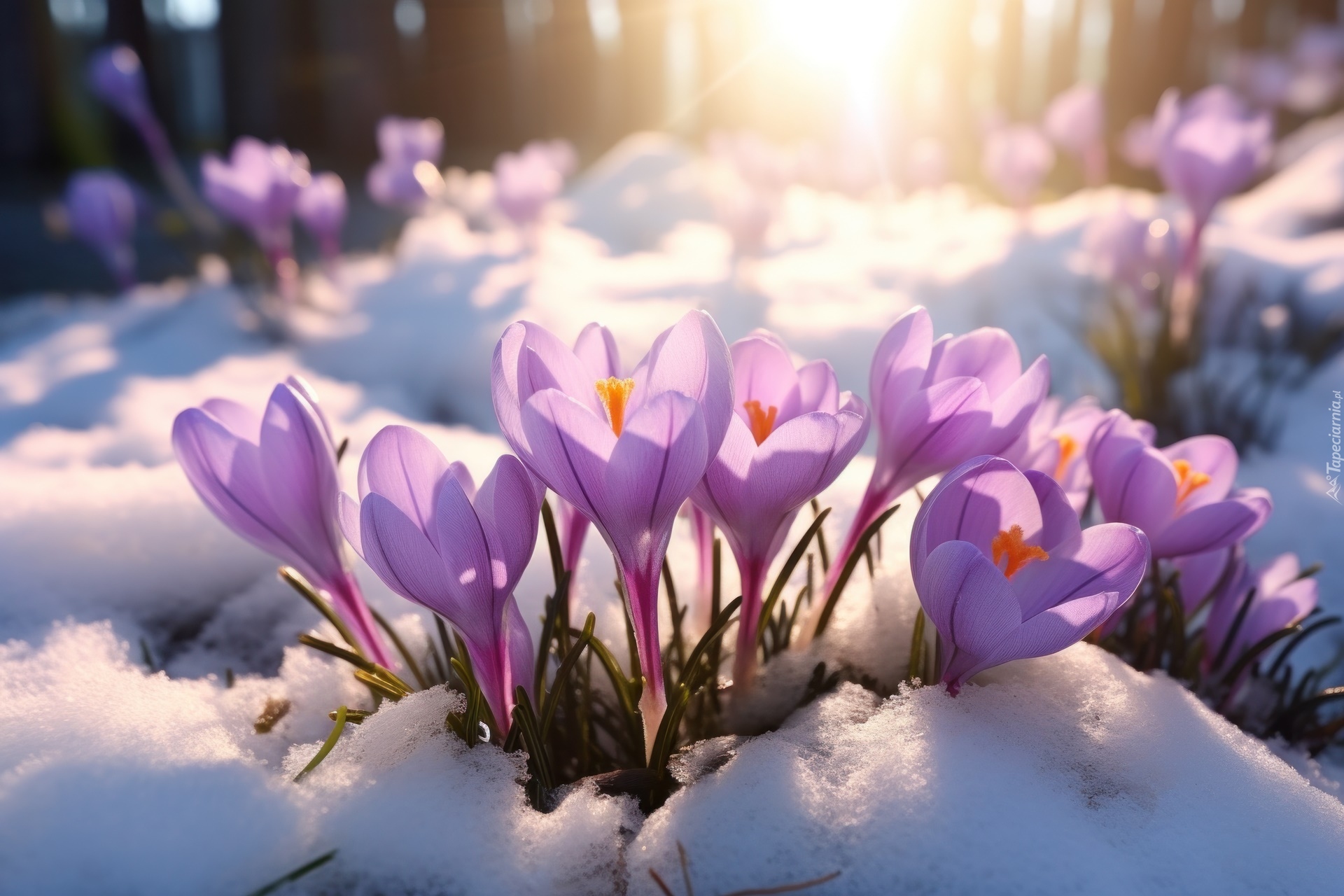Edytor tapety: Rozświetlone blaskiem słońca fioletowe krokusy w śniegu