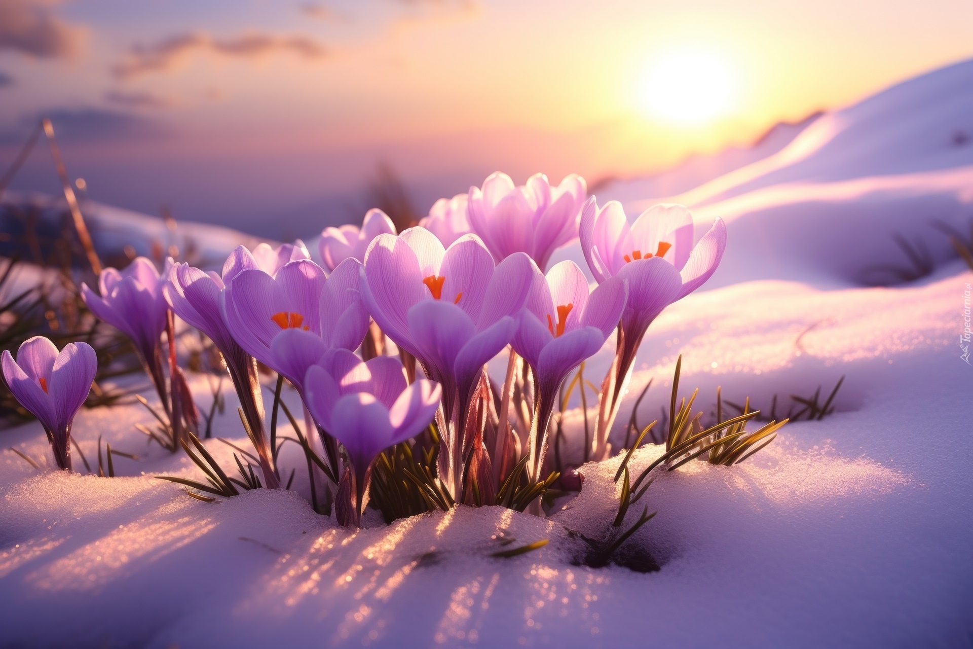 Edytor tapety: Krokusy w śniegu oświetlone blaskiem słońca