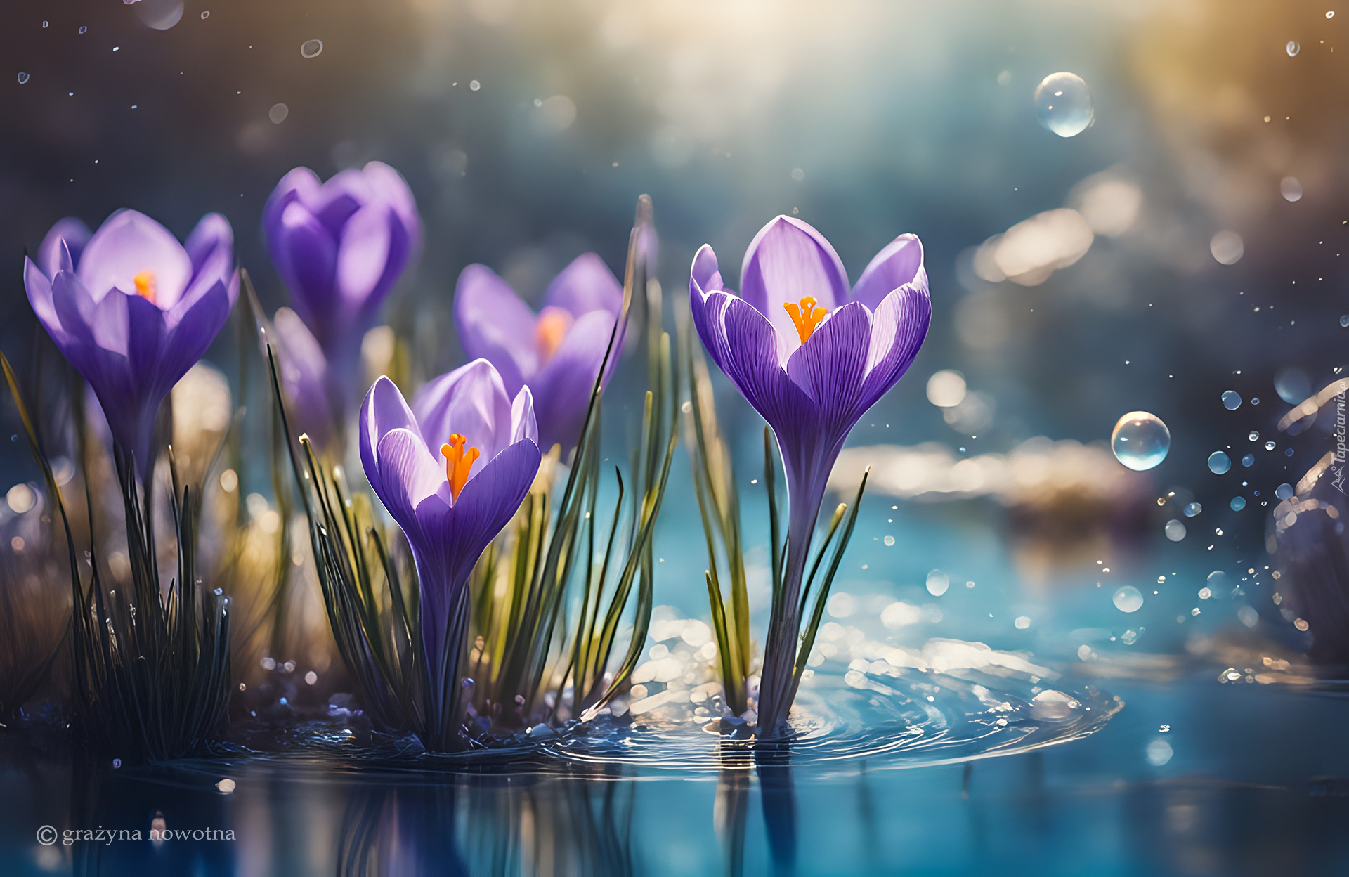 Edytor tapety: Fioletowe krokusy i spadające krople wody