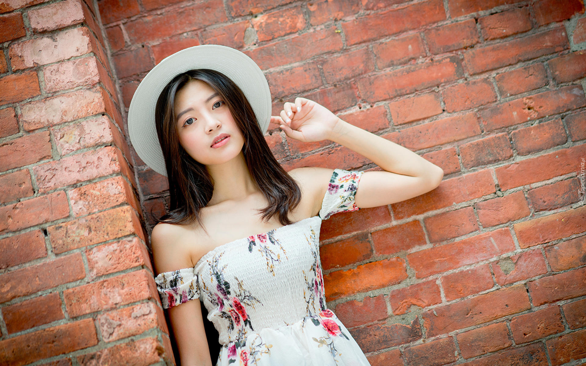 Edytor tapety: Kobieta w kapeluszu oparta o ścianę z cegieł