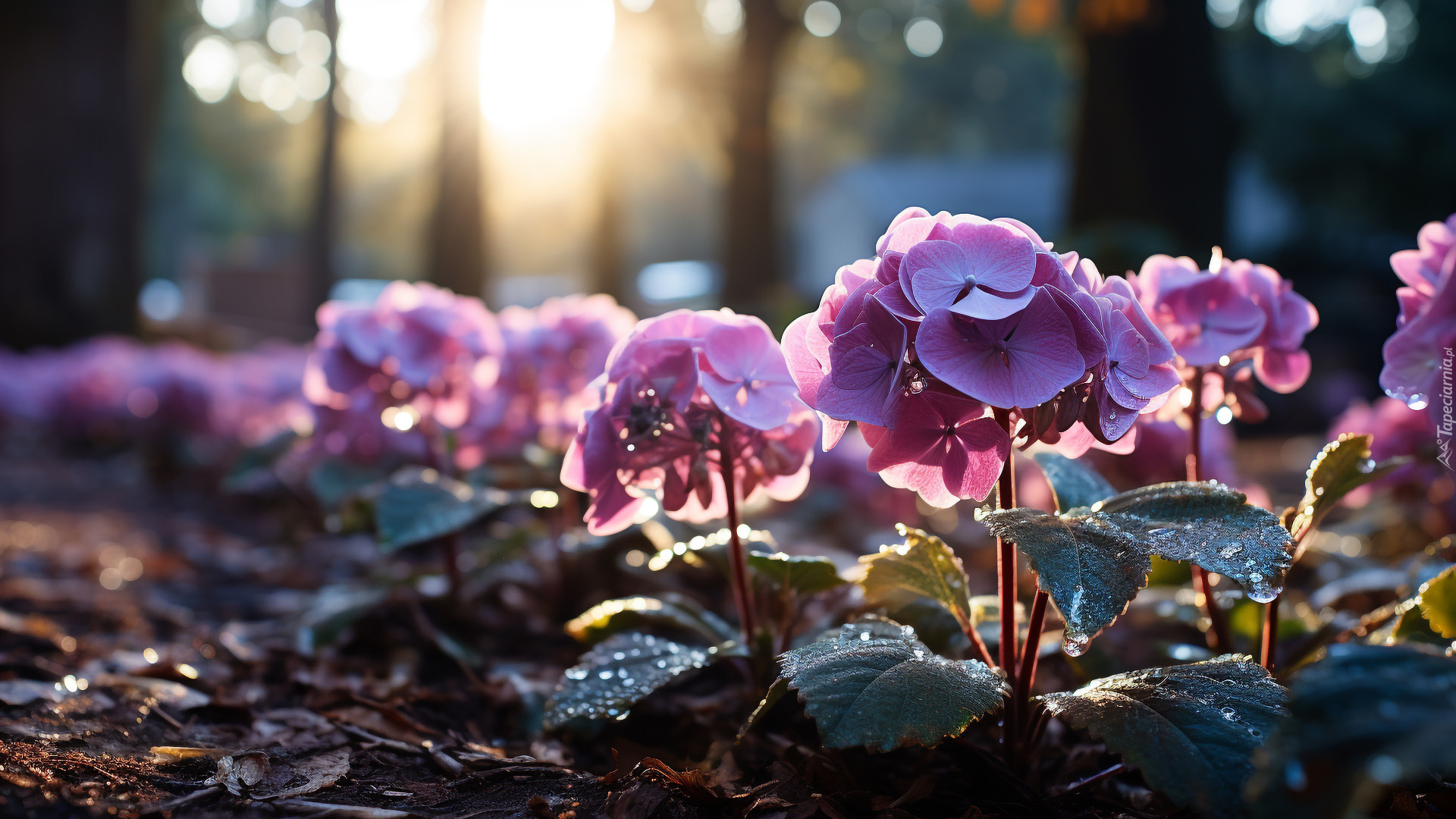 Edytor tapety: Fioletowe rozświetlone hortensje z kroplami wody