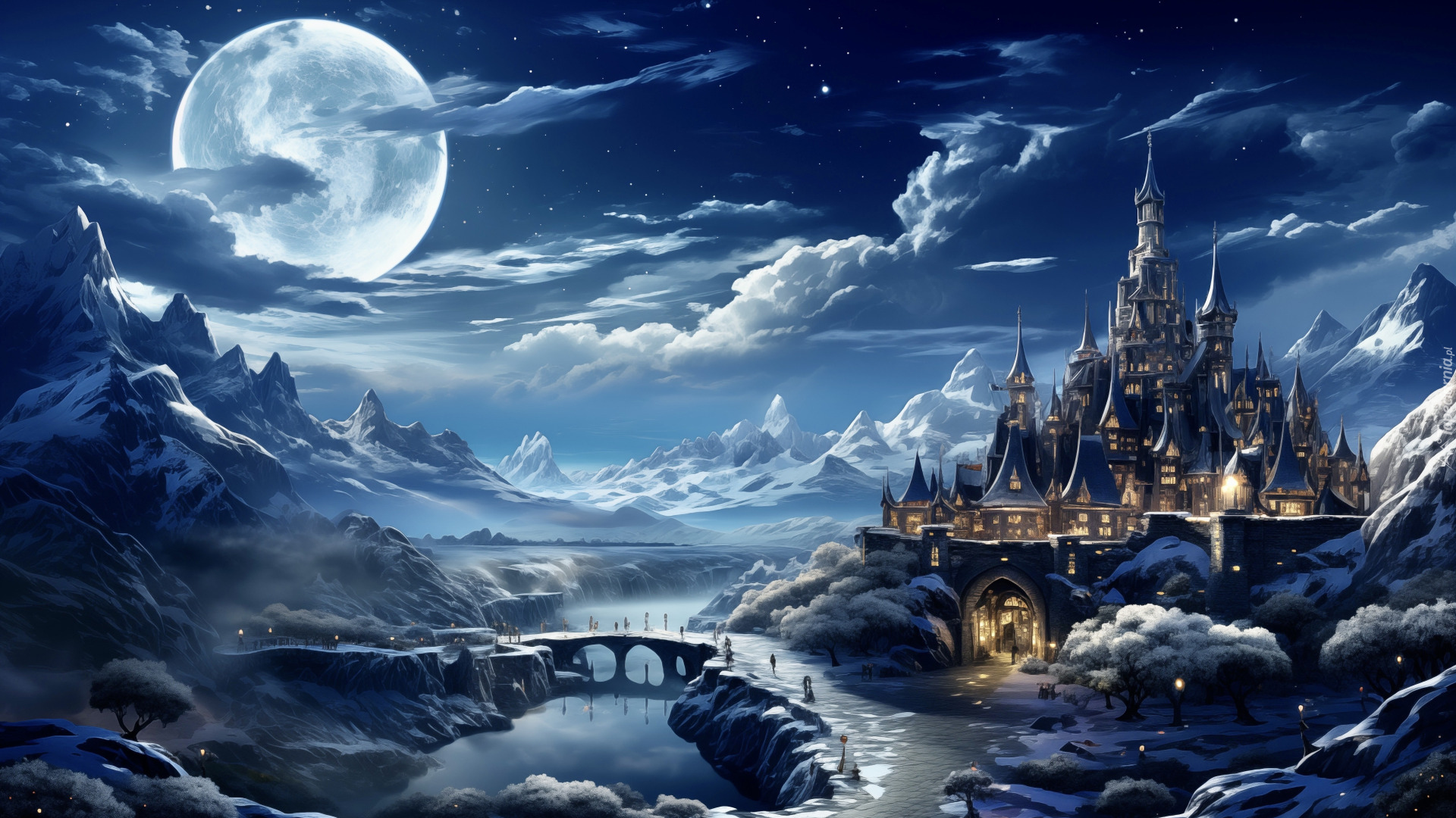 Edytor tapety: Rozświetlony zamek nad rzeką w księżycowym blasku