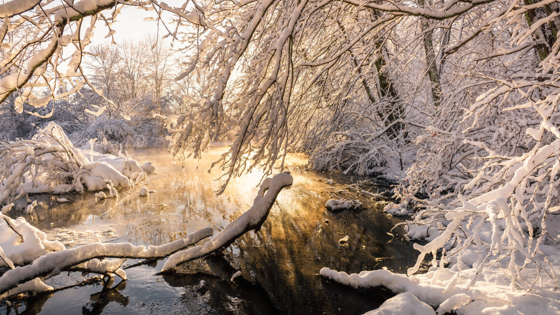 Edytor tapety: Ośnieżone gałęzie nad wodą w słonecznym blasku
