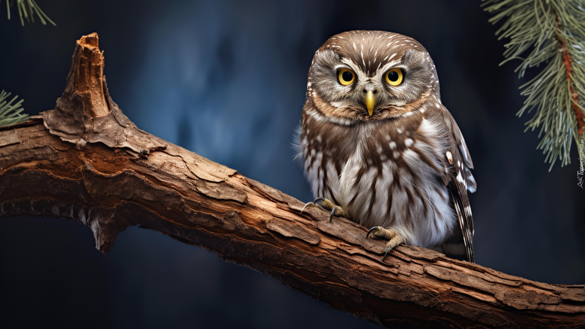 Edytor tapety: Pójdźka na konarze drzewa iglastego