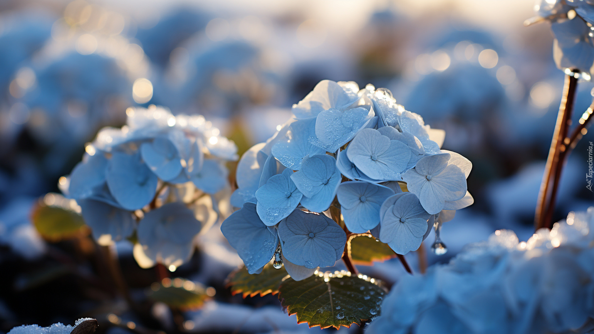 Edytor tapety: Krople na niebieskiej hortensji i liściach