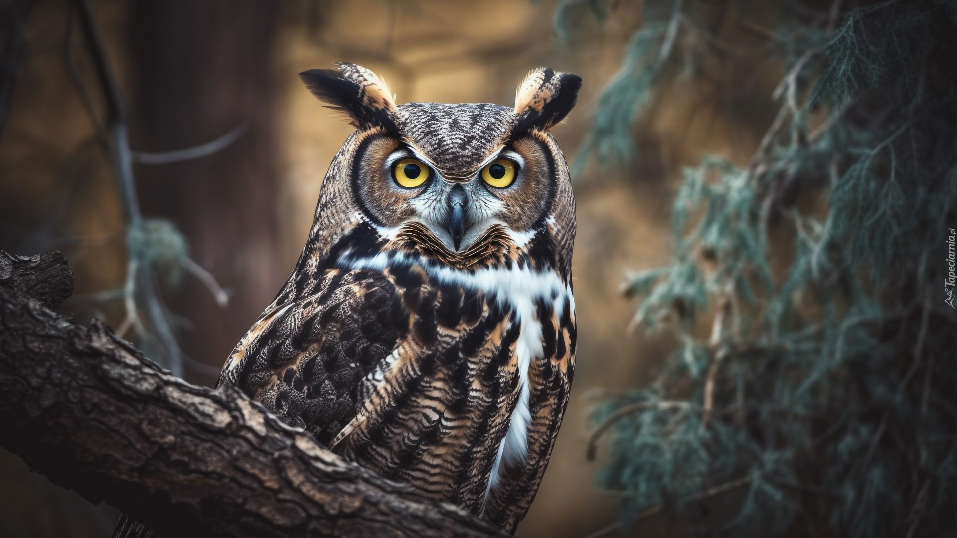 Edytor tapety: Puchacz na gałęzi drzewa
