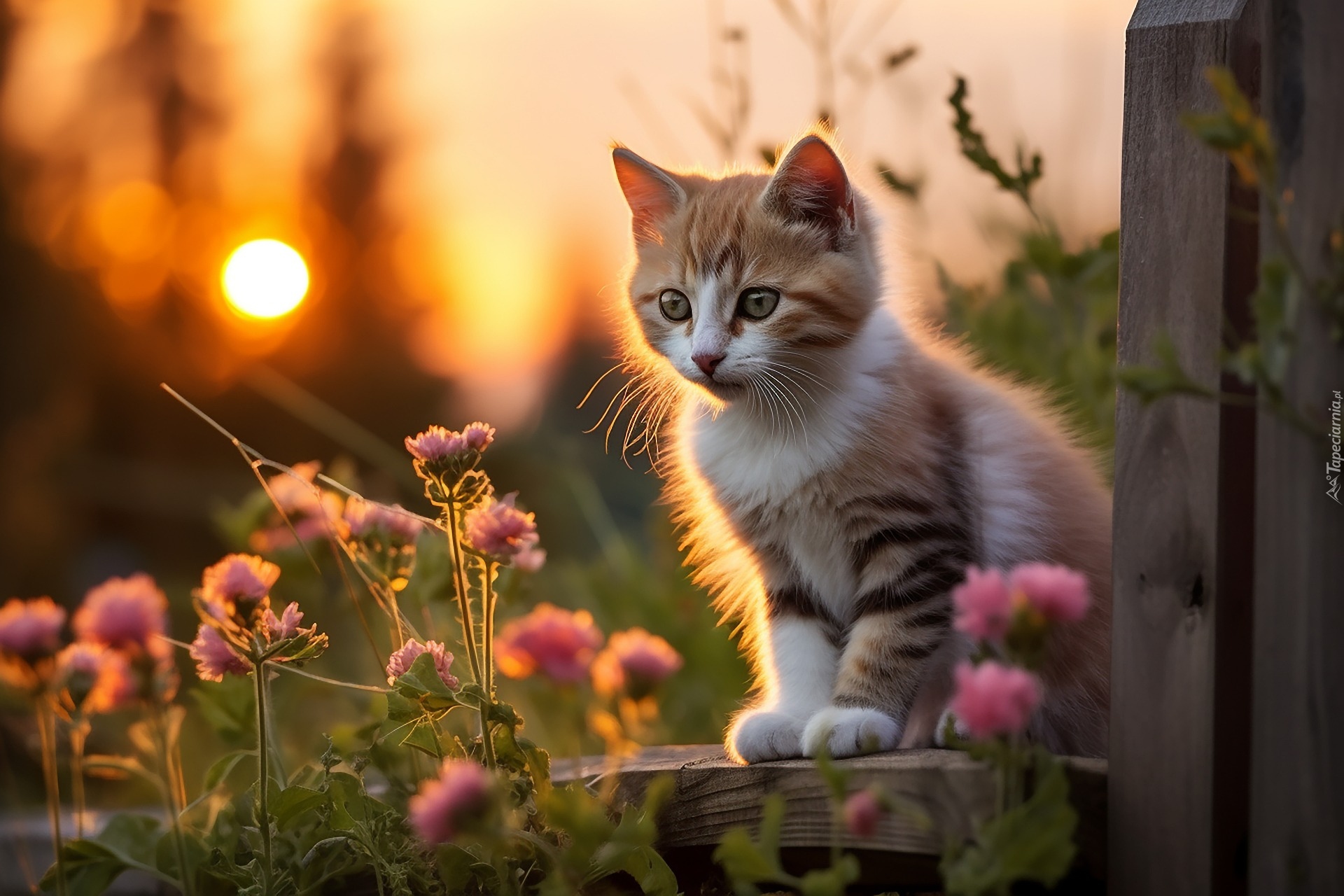 Edytor tapety: Mały kotek i kwiaty przy ogrodzeniu