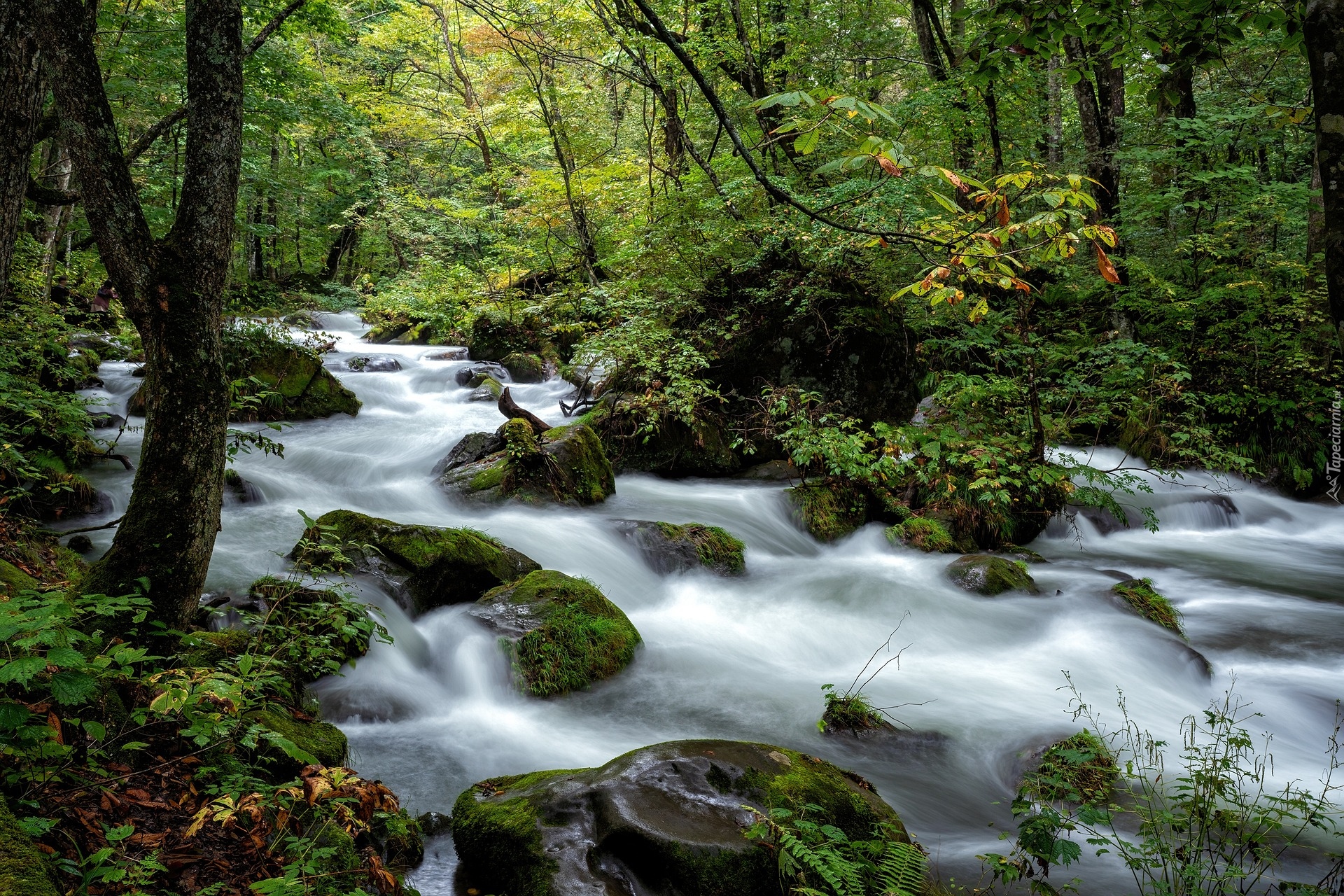 Edytor tapety: Omszałe skały w leśnym potoku