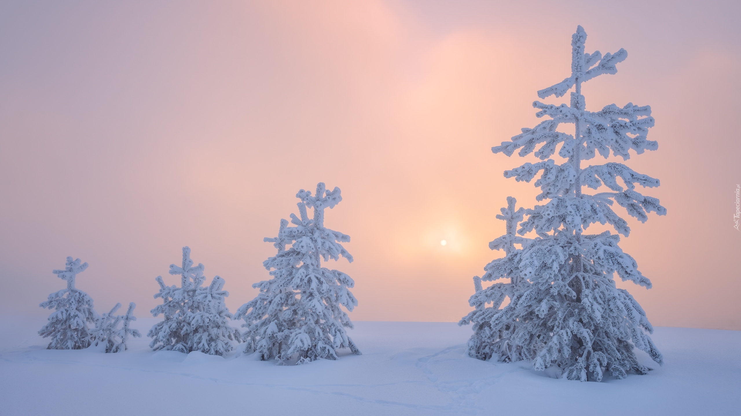 Edytor tapety: Ośnieżone drzewa na tle zamglonego słońca