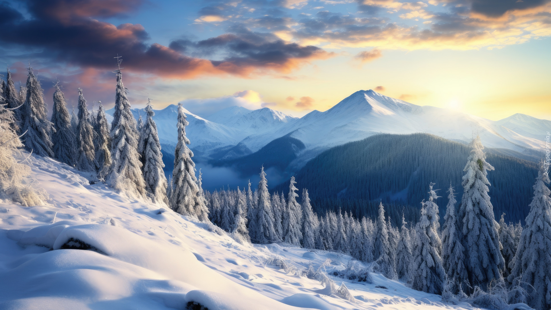 Edytor tapety: Ośnieżone i zalesione zbocze górskie