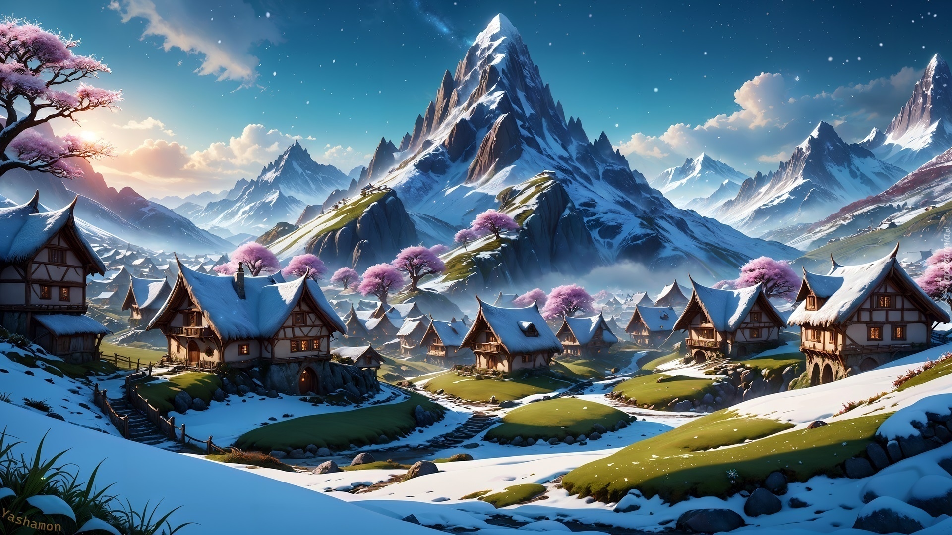 Edytor tapety: Domki u podnóża ośnieżonych skalistych gór