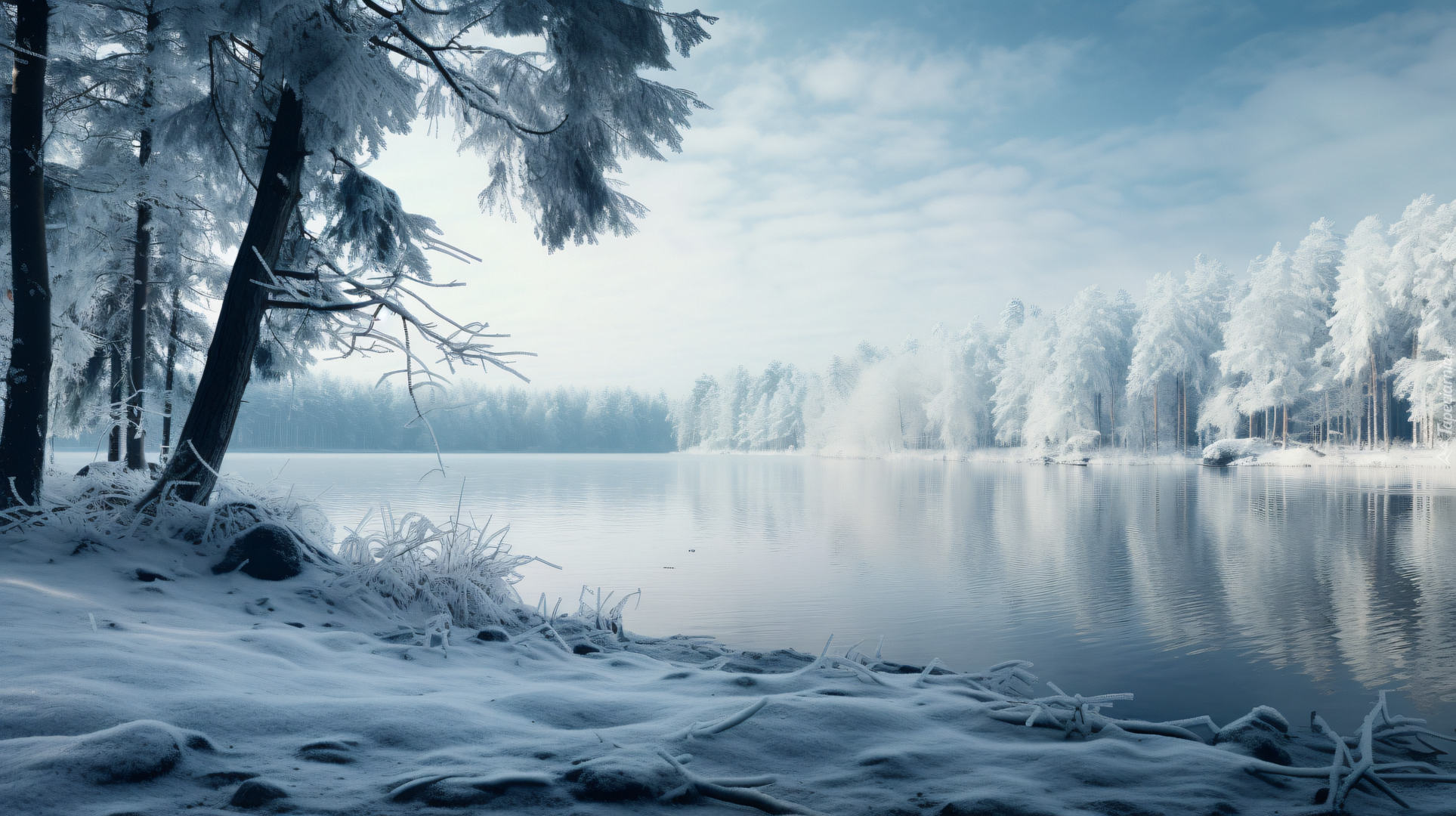 Edytor tapety: Oszronione drzewa w śniegu na brzegu jeziora
