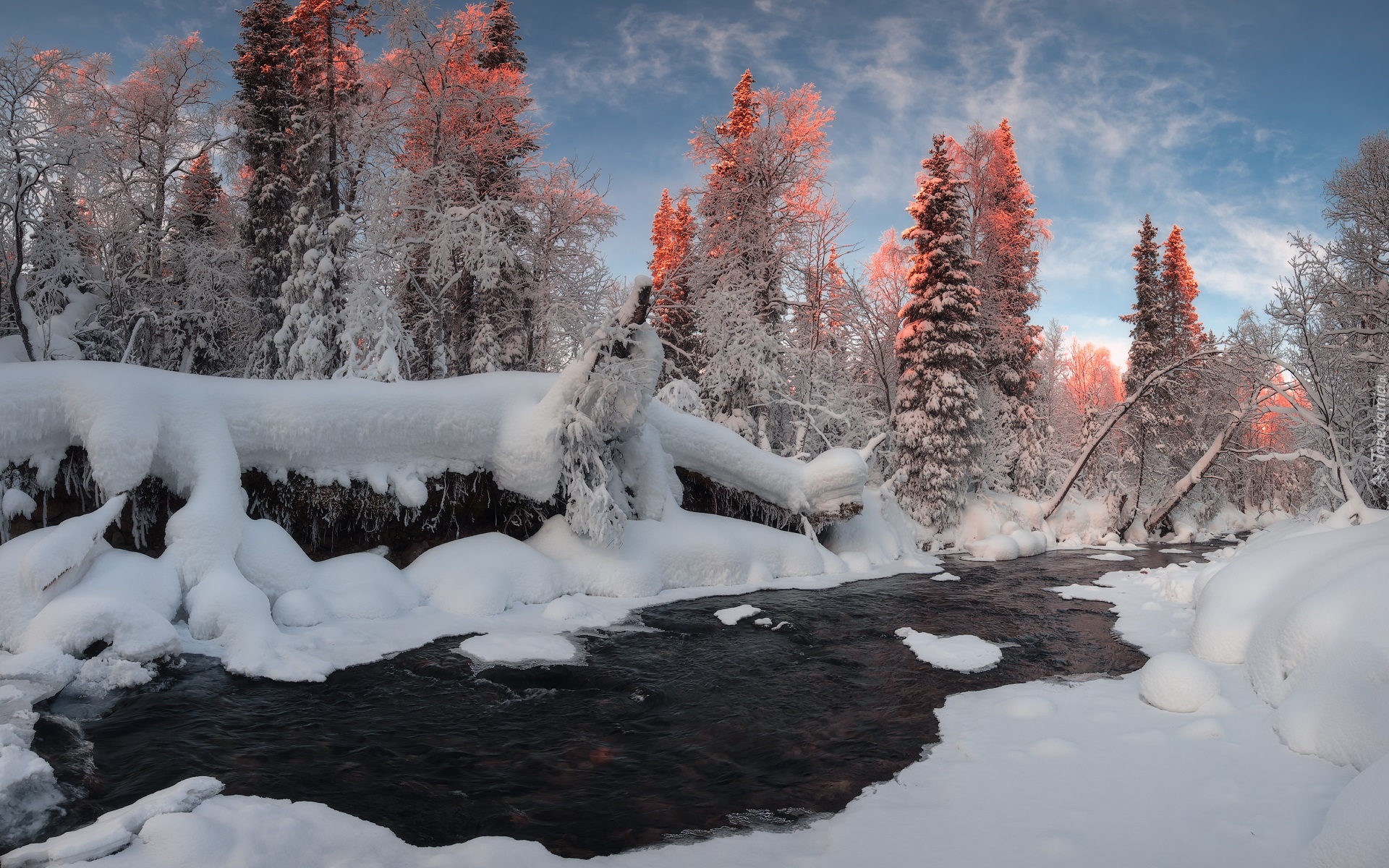 Edytor tapety: Rozświetlone wierzchołki drzew w śniegu nad rzeką