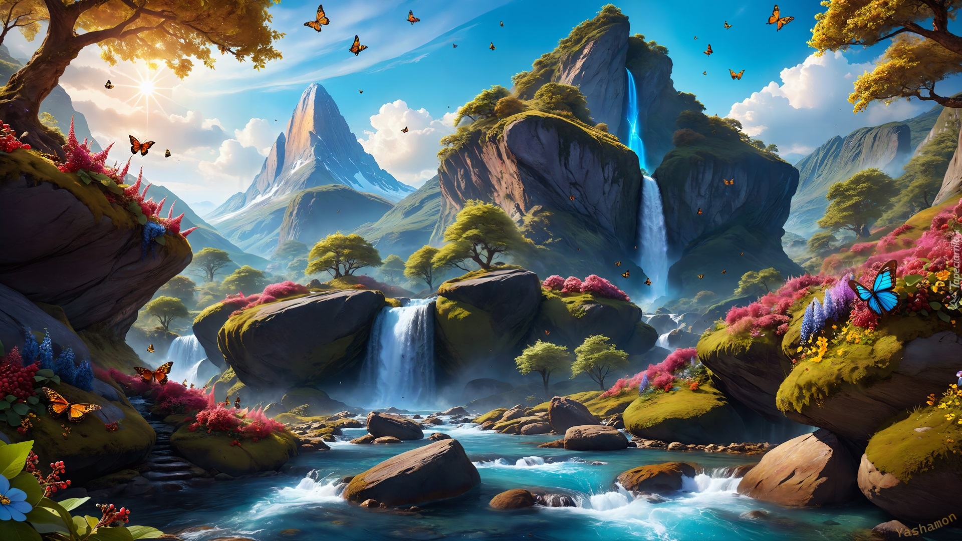 Edytor tapety: Kwiaty i wodospady na skałach w grafice