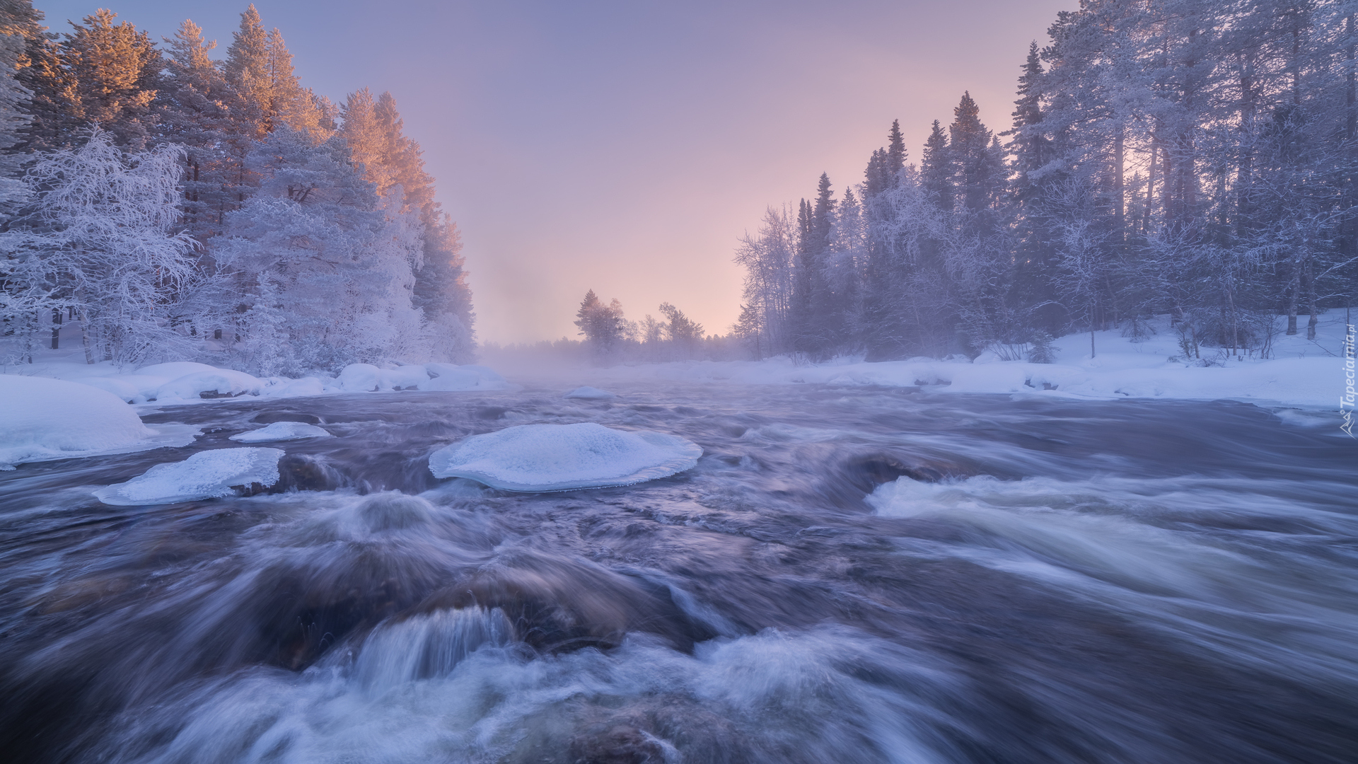 Edytor tapety: Ośnieżone drzewa na brzegach rwącej rzeki