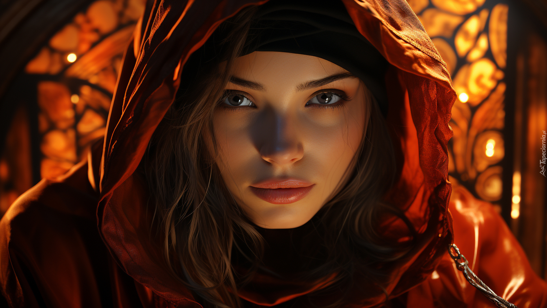 Edytor tapety: Twarz kobiety w pomarańczowym kapturze