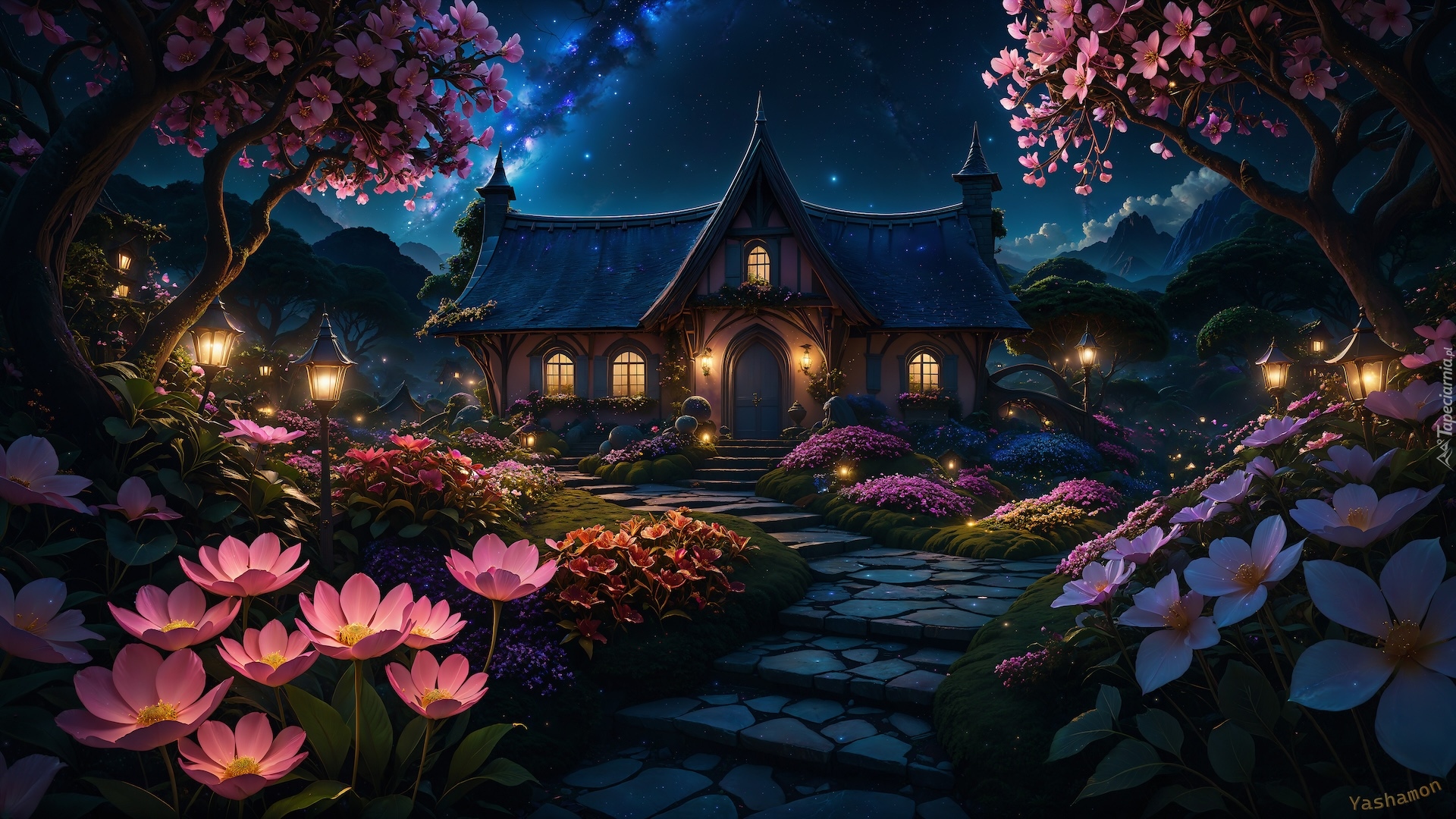 Edytor tapety: Kamieniste schody wśród kwiatów prowadzące do domu