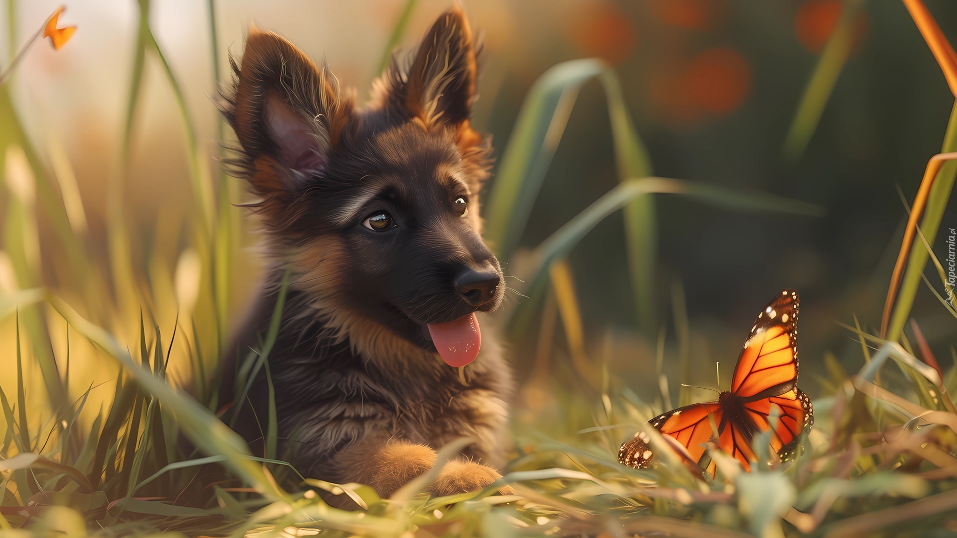 Edytor tapety: Szczeniak owczarka niemieckiego i motyl na trawie
