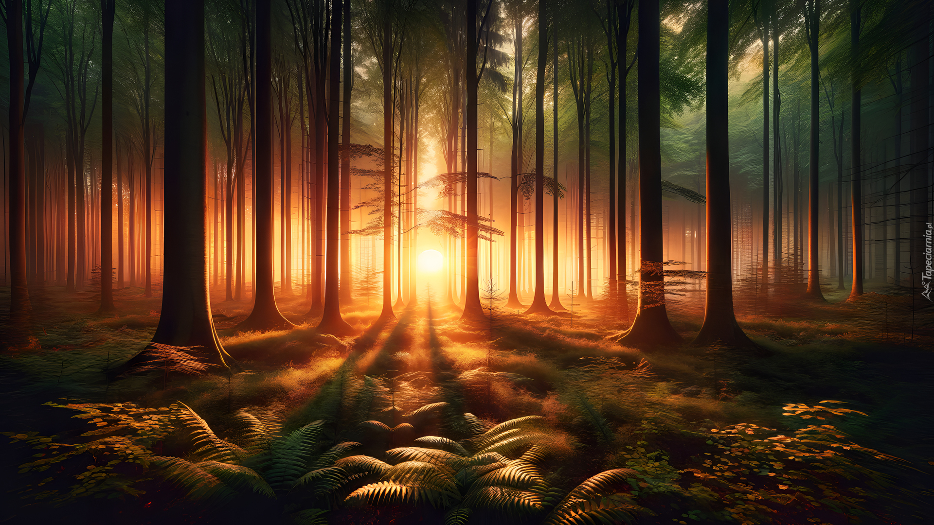 Edytor tapety: Las w blasku wschodzącego słońca