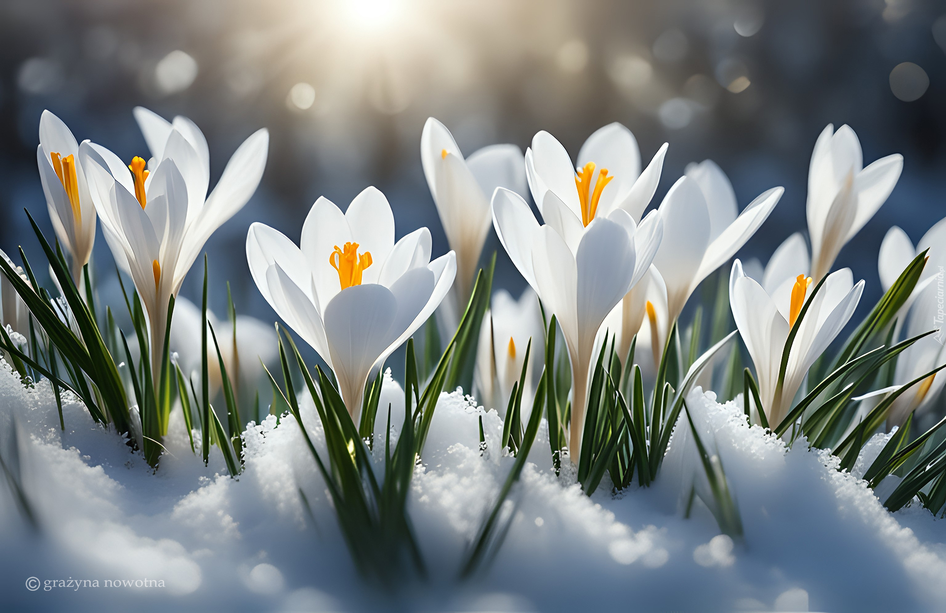 Edytor tapety: Rozświetlone słonecznym blaskiem białe krokusy w śniegu