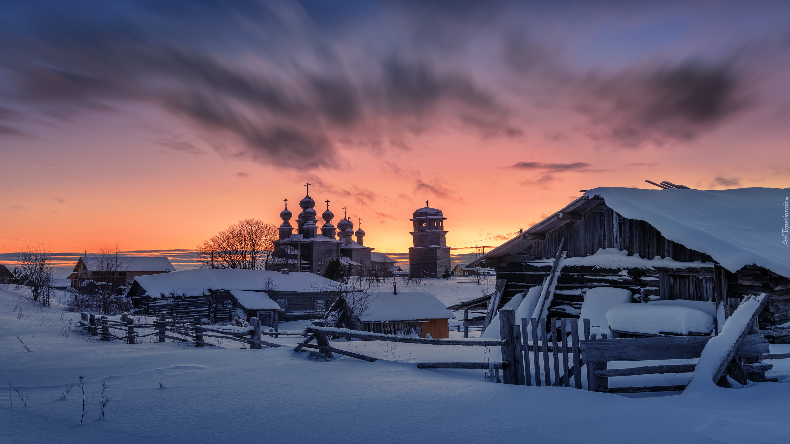 Edytor tapety: Ośnieżone domy i cerkiew o zachodzie słońca