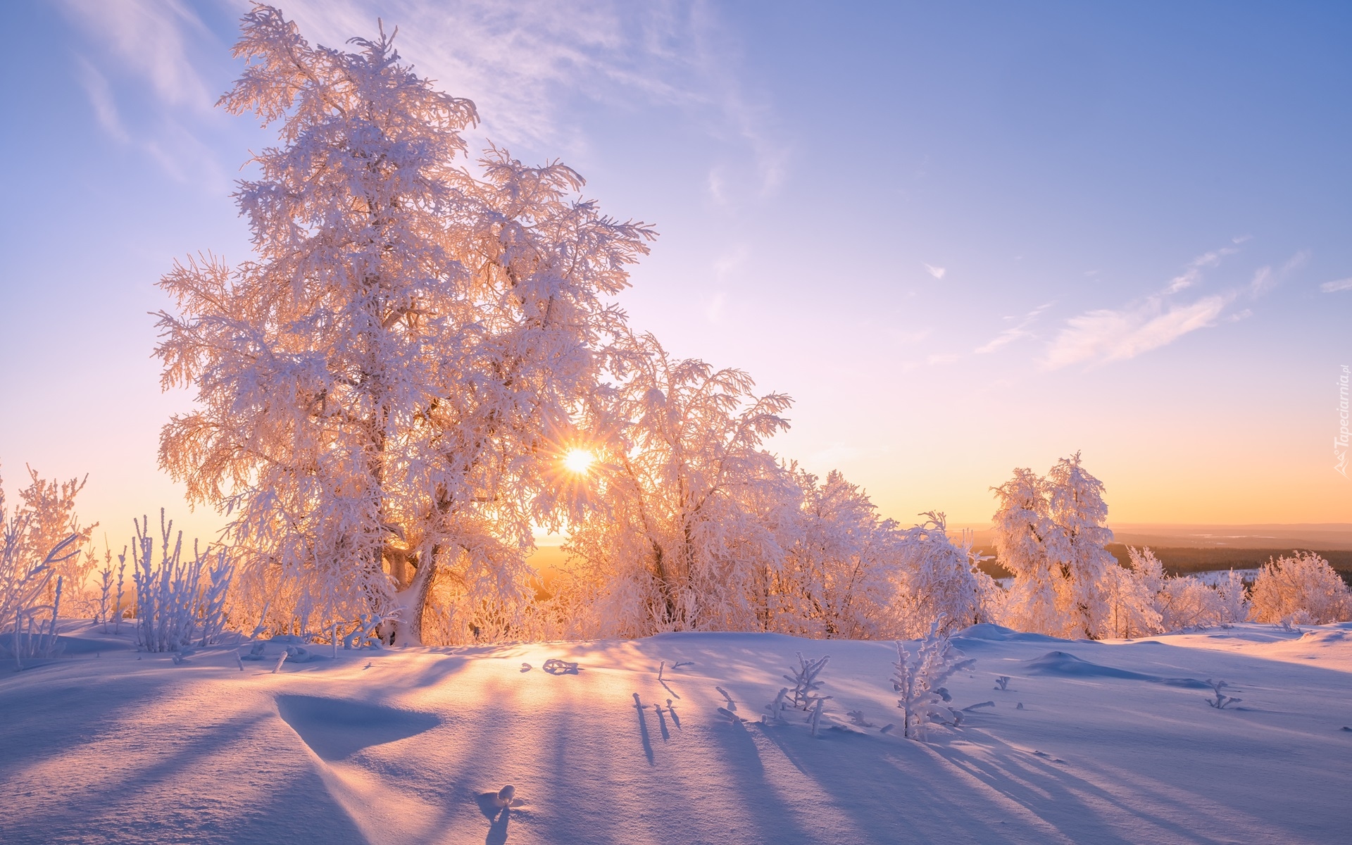 Edytor tapety: Promienie słońca wśród ośnieżonych drzew