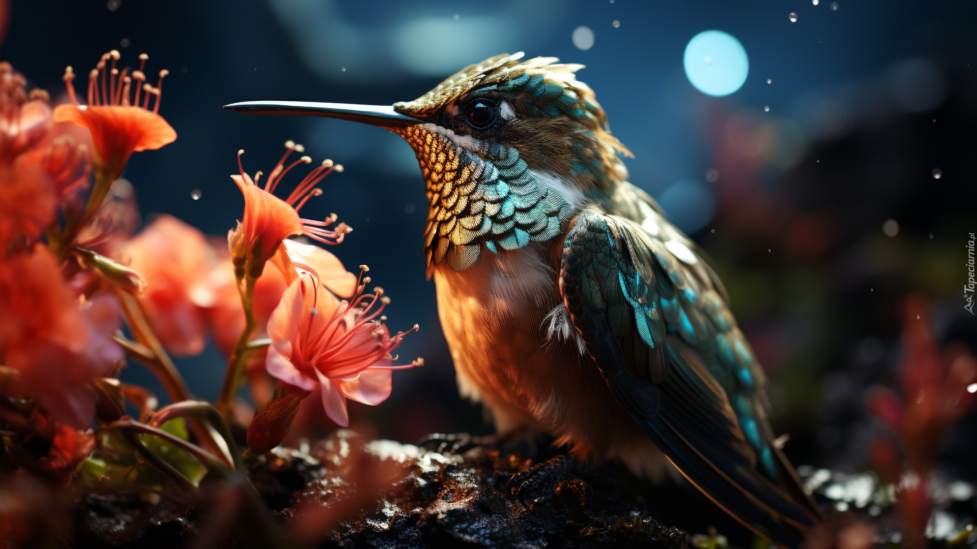 Edytor tapety: Koliber obok rozświetlonych kwiatów