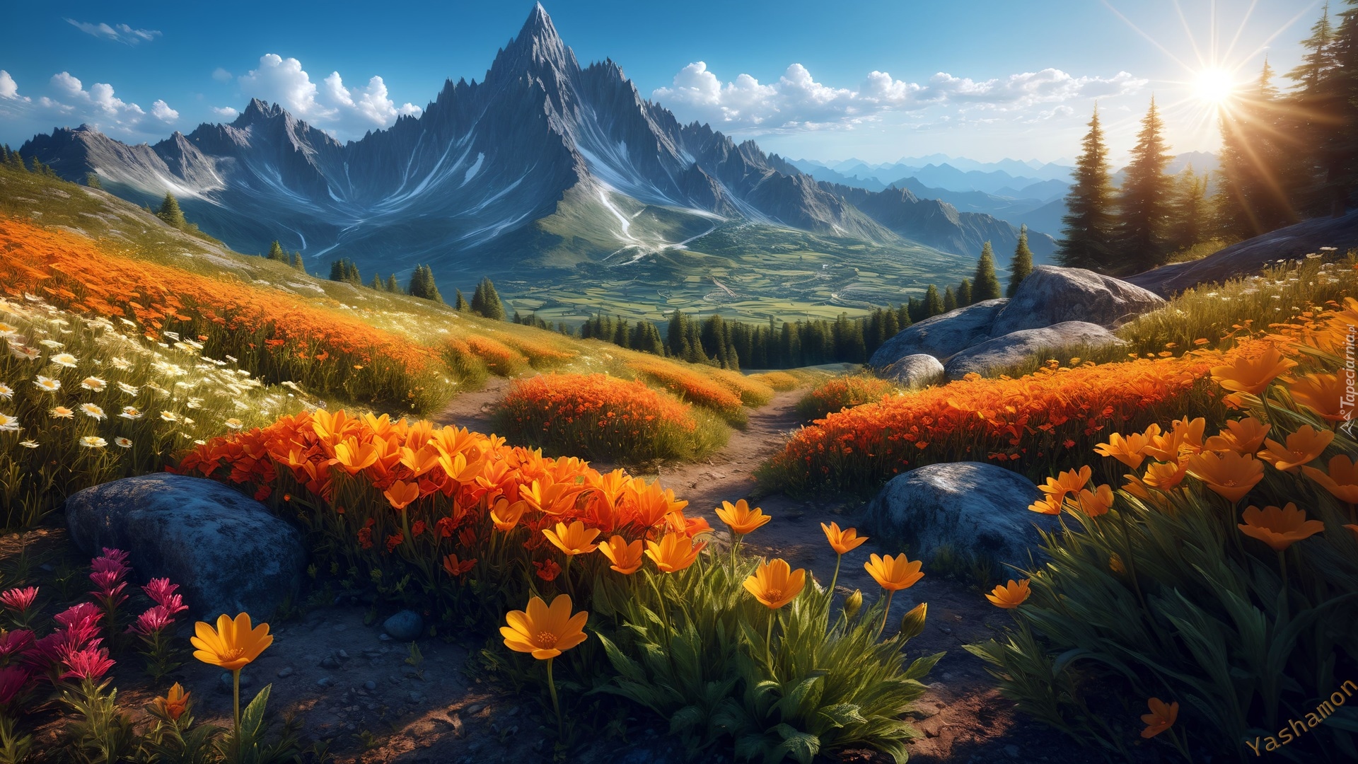 Edytor tapety: Widok z ukwieconej łąki na góry