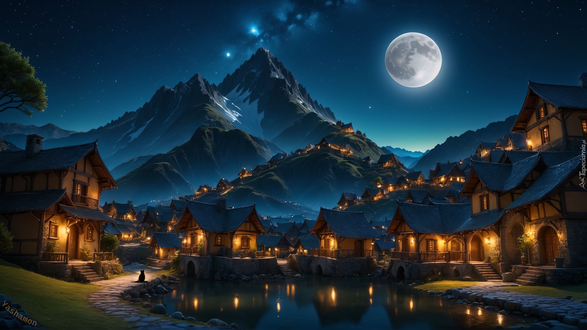 Edytor tapety: Księżyc nad oświetloną wioską w górach