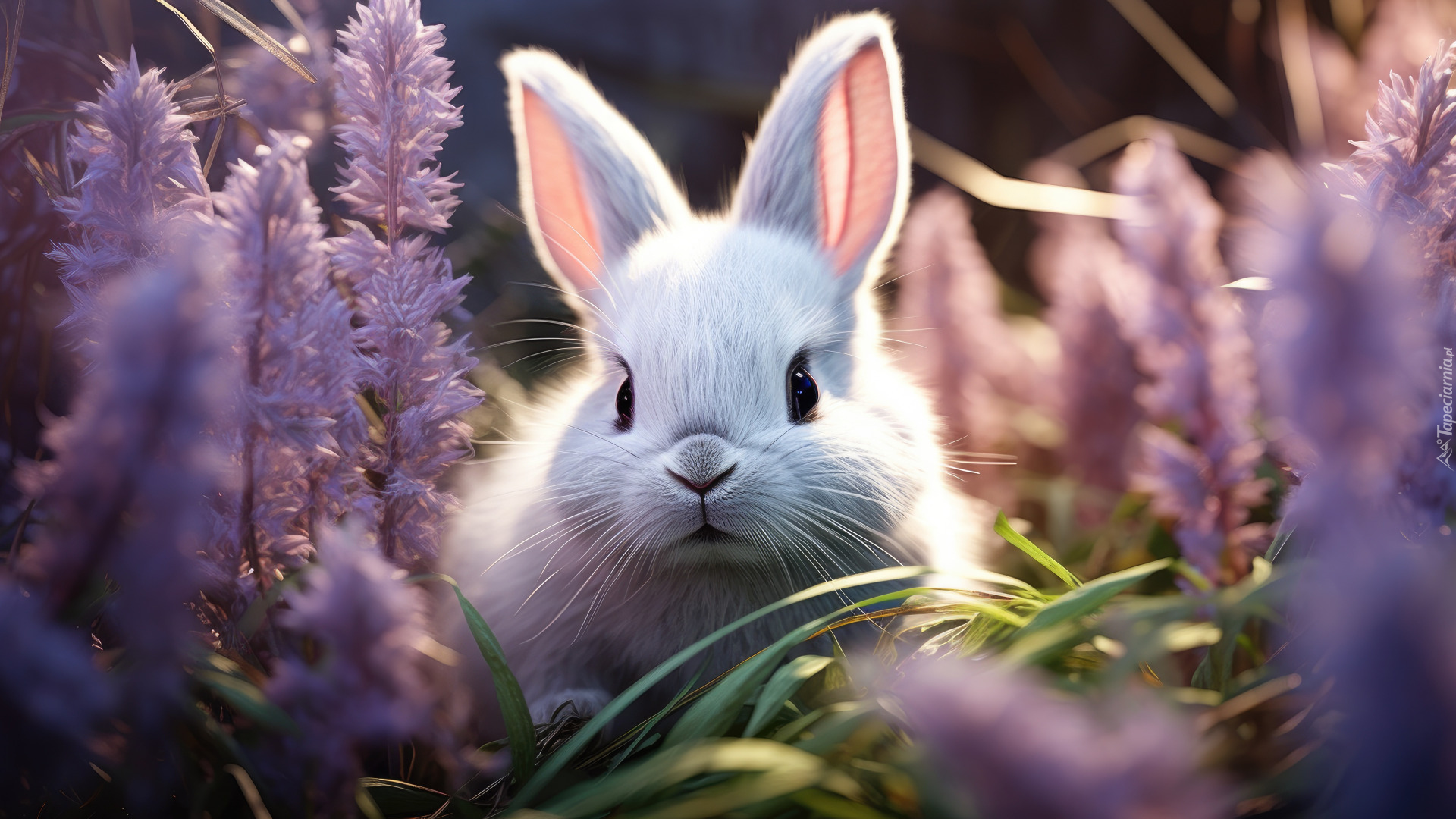 Edytor tapety: Biały królik wśród fioletowych kwiatów