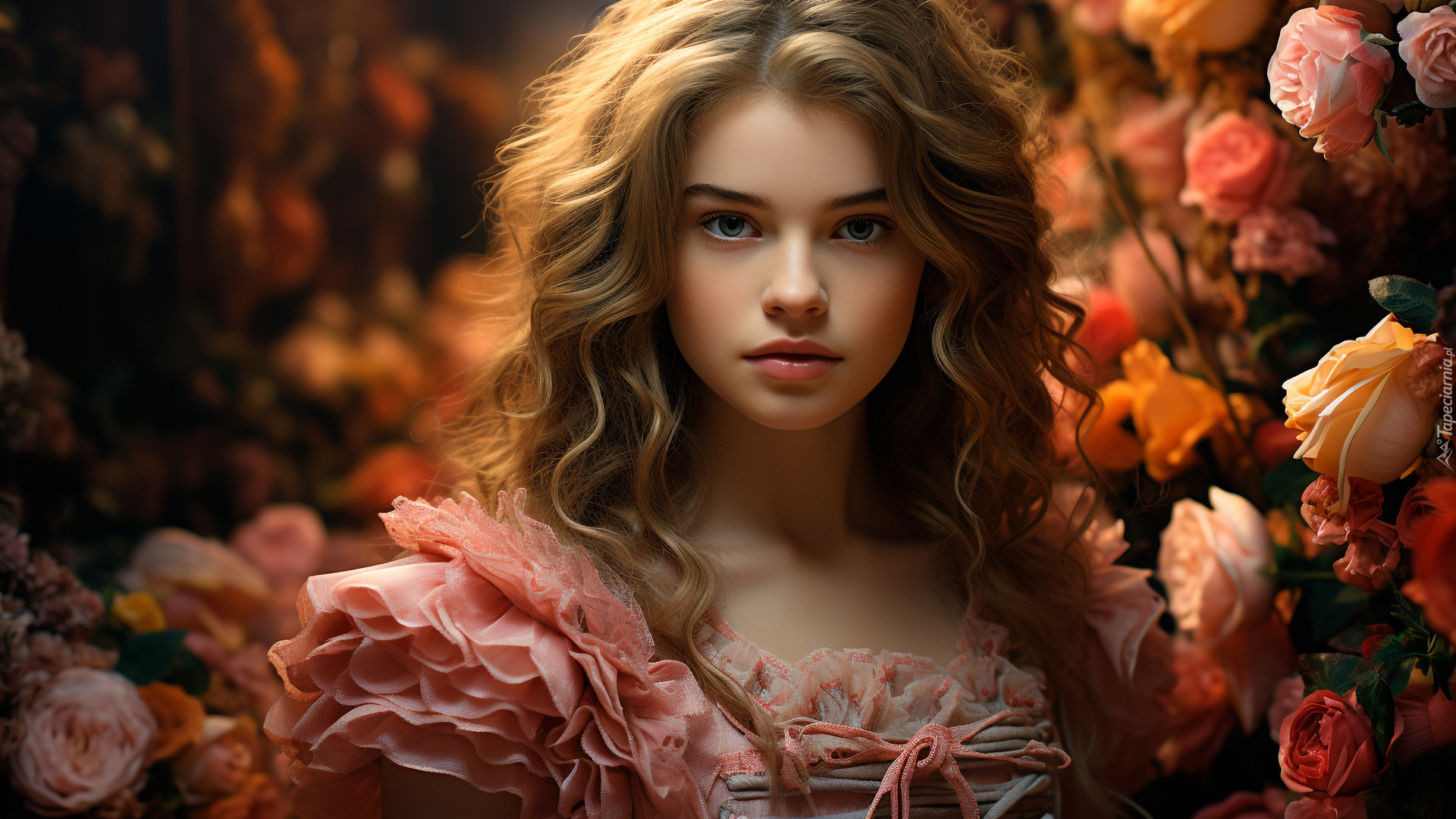 Edytor tapety: Długowłosa kobieta wśród kwiatów