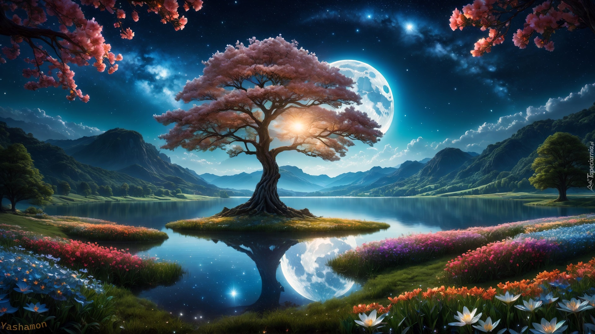 Edytor tapety: Drzewo na małej wysepce po środku jeziora