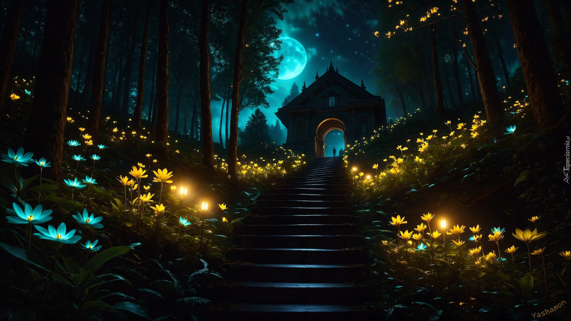 Edytor tapety: Rozświetlone kwiaty przy schodach na tle księżyca