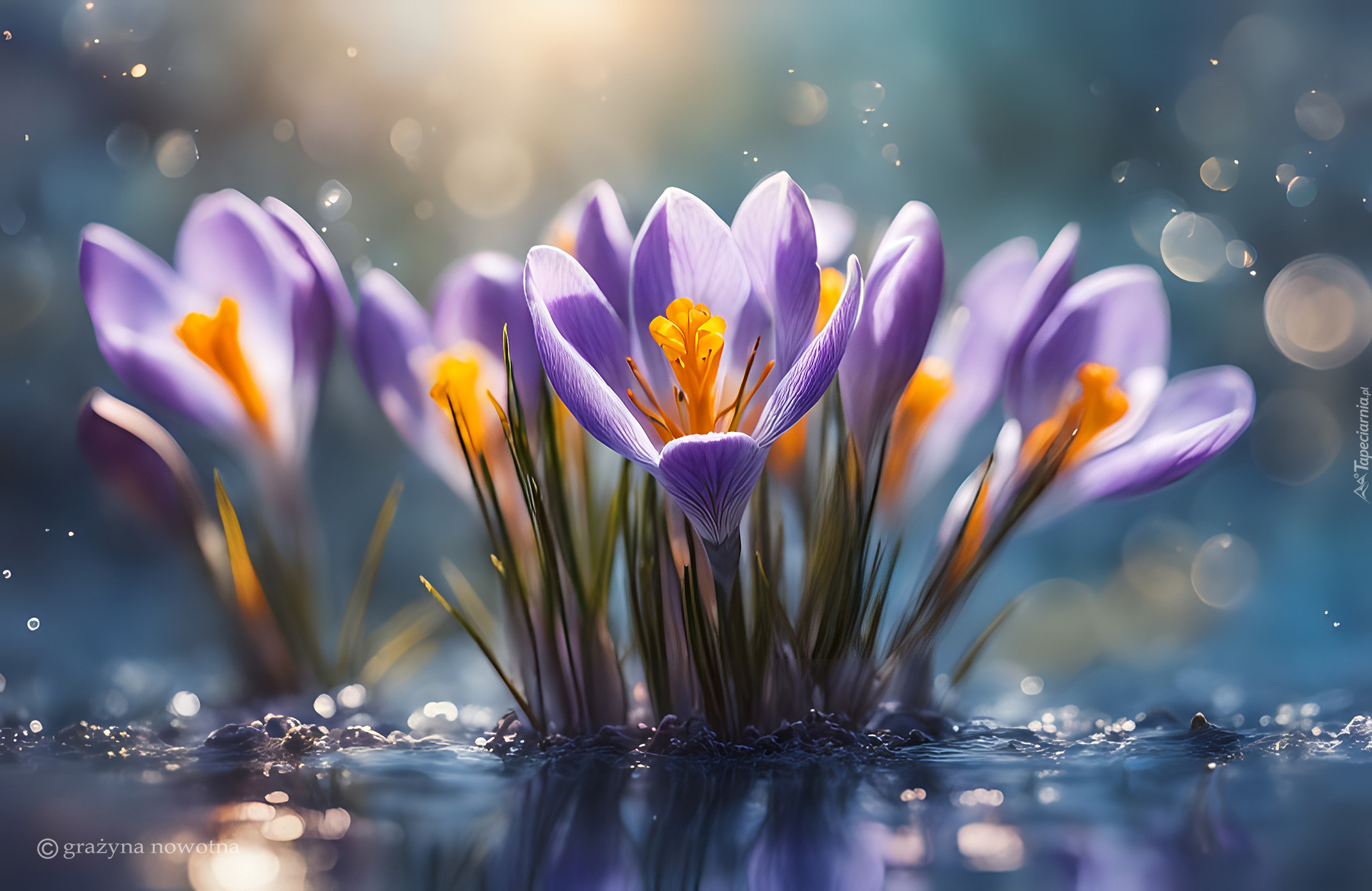 Edytor tapety: Rozświetlone blaskiem słońca fioletowe krokusy w wodzie