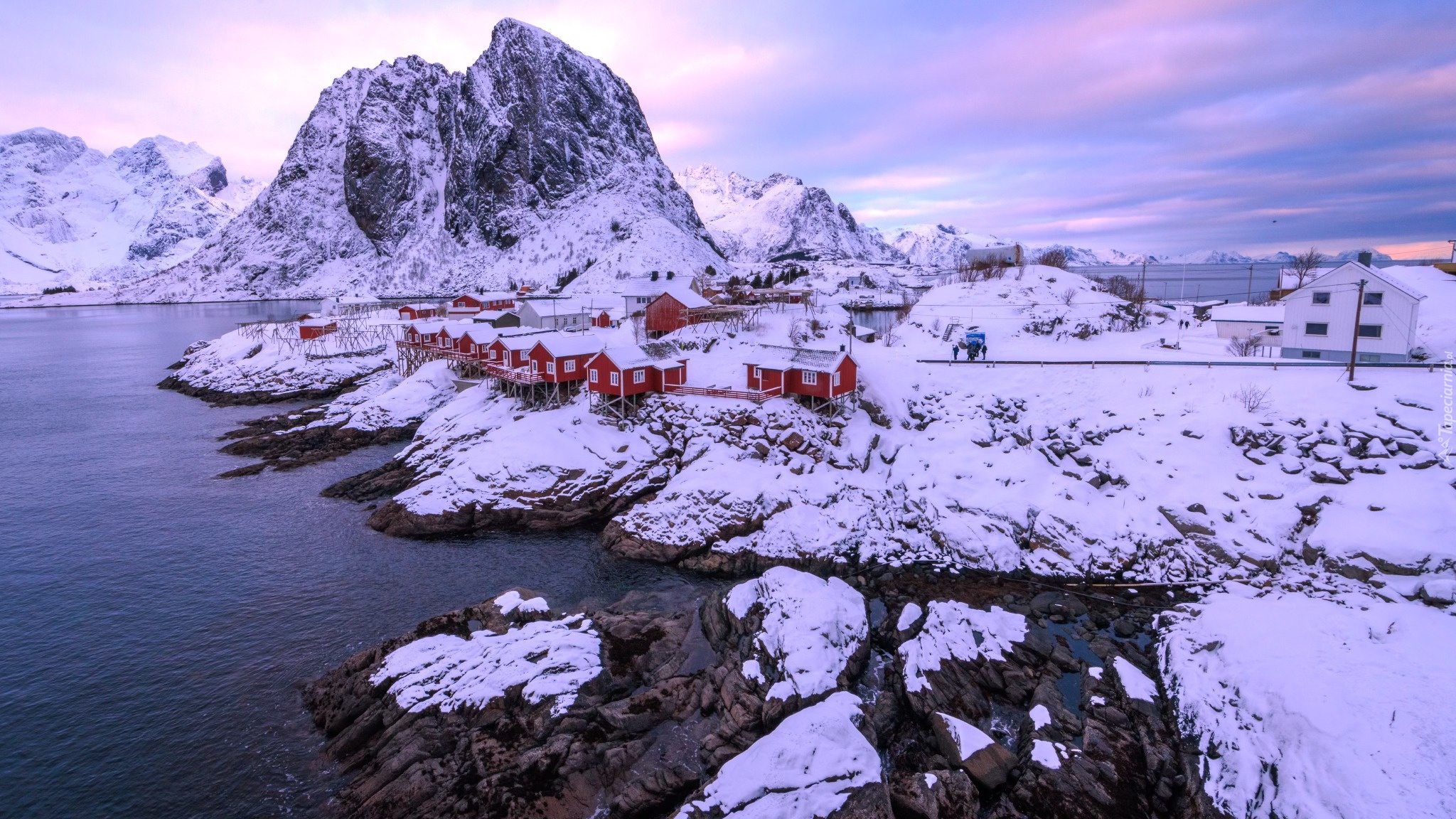 Edytor tapety: Ośnieżone czerwone domki na norweskich Lofotach