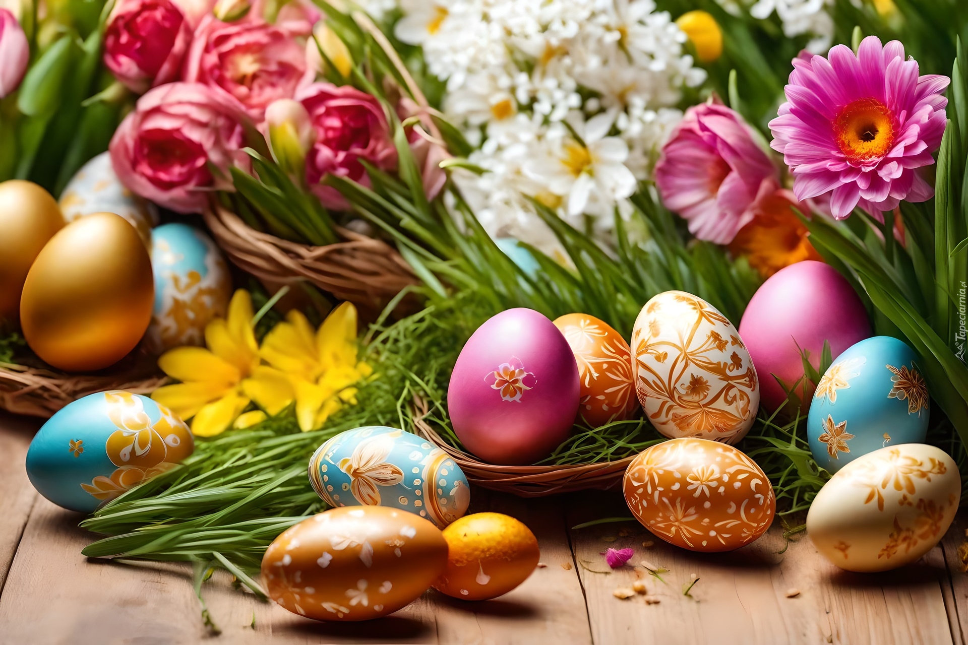 Edytor tapety: Kolorowe kwiaty i pisanki w koszykach
