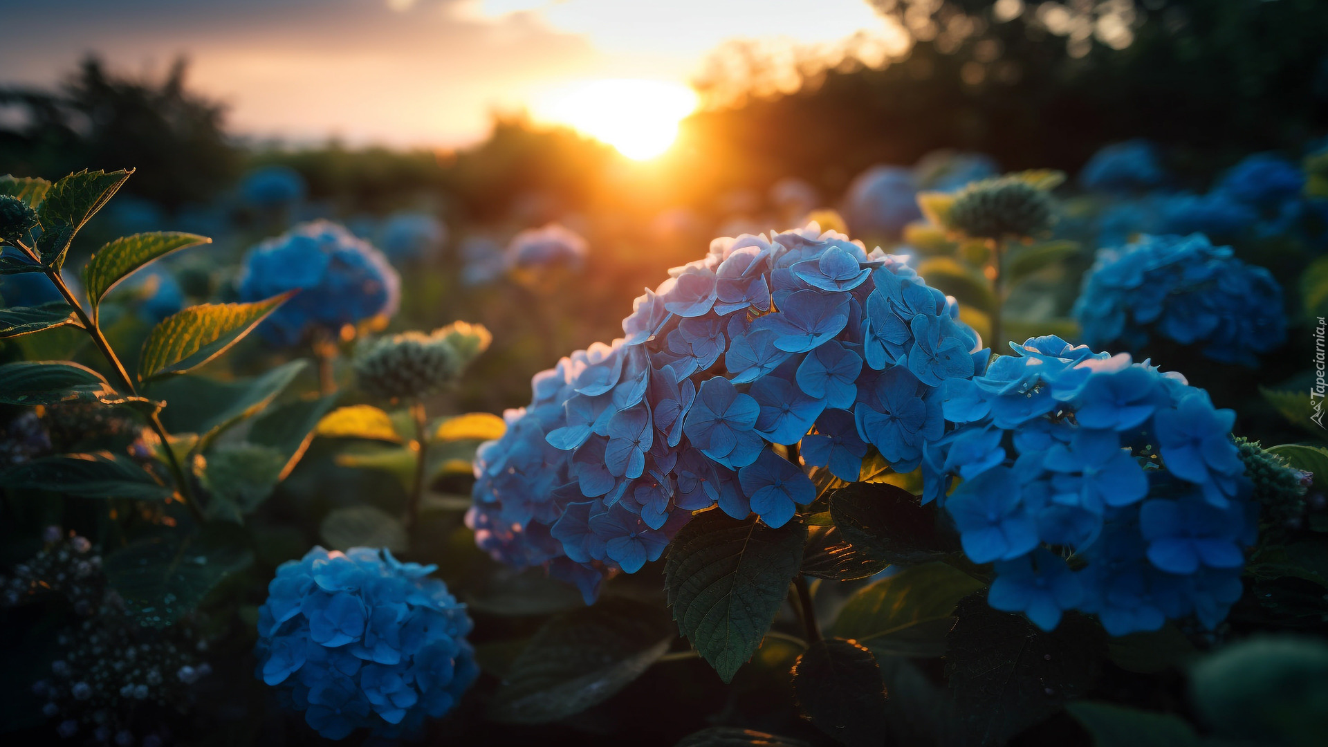 Edytor tapety: Oświetlone zachodzącym słońcem hortensje